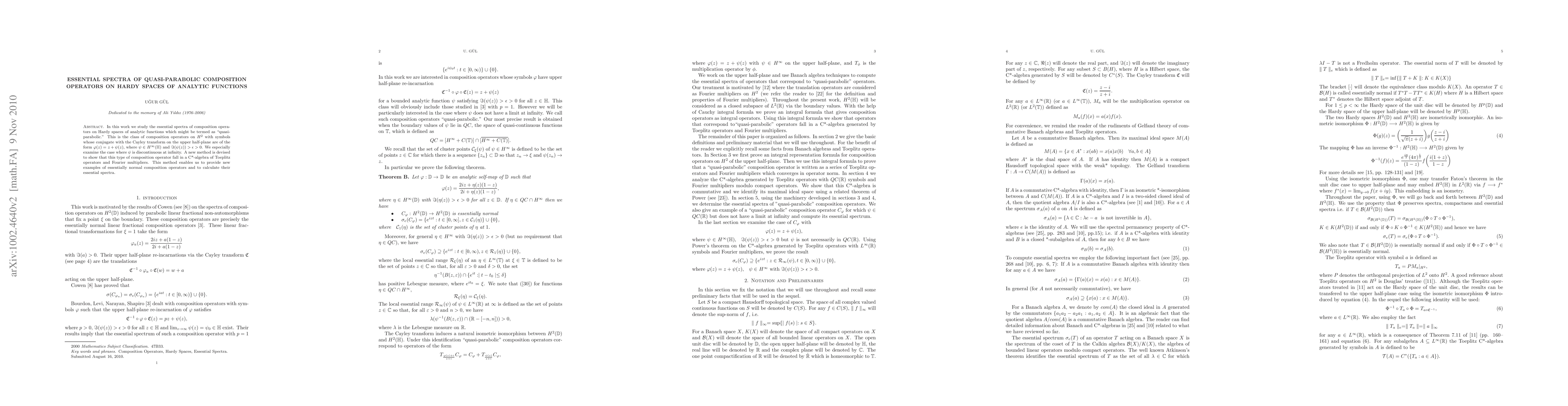 This paper investigates the essential spectra of quasi-parabolic composition operators on Hardy spaces, showing they belong to a C*-algebra of Toeplitz operators and Fourier multipliers, and provides new examples of essentially normal composition operators with calculated essential spectra.