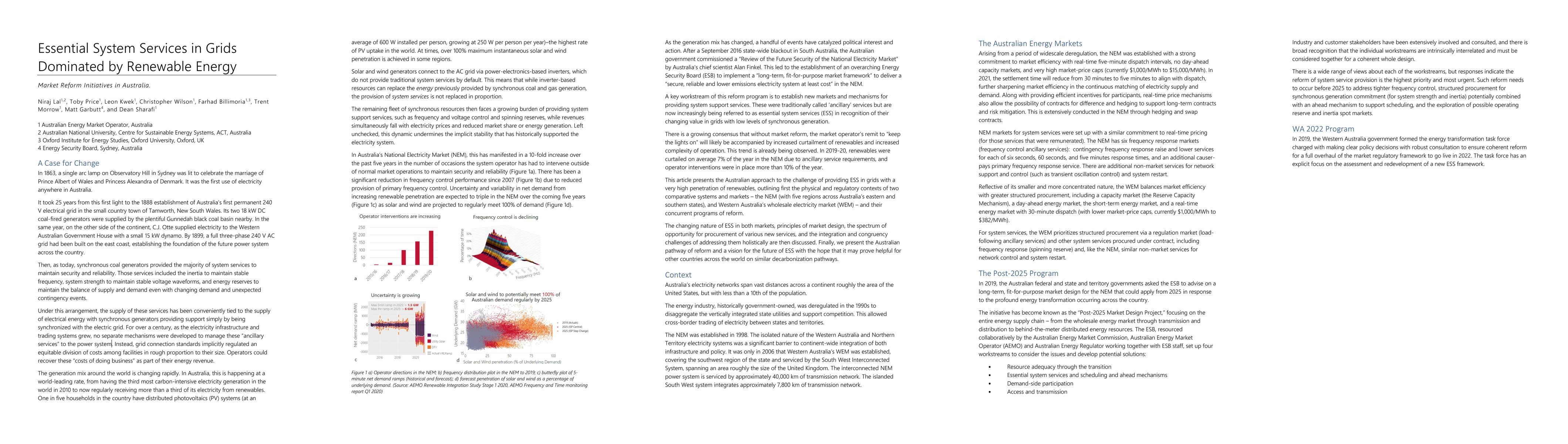 This paper investigates the evolving frameworks for Essential System Services (ESS) in electricity grids increasingly dominated by variable renewable energy. It explores new technical, economic, and regulatory approaches, including the use of demand curves and nomograms, and examines the role of the Hornsdale Power Reserve in shaping future market incentives. The study also reviews advanced technologies like grid-forming inverters and synthetic inertia for secure grid operation.