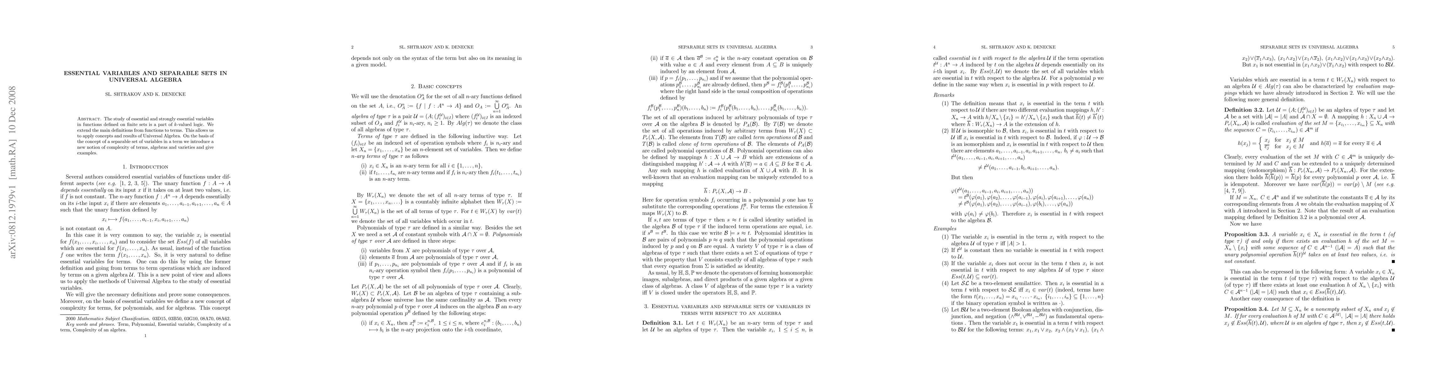 The study of essential and strongly essential variables in functions defined on finite sets is a part of $k$-valued logic. We extend the main definitions from functions to terms. This allows us to apply concepts and results of Universal Algebra. On the basis of the concept of a separable set of variables in a term we introduce a new notion of complexity of terms, algebras and varieties and give examples.