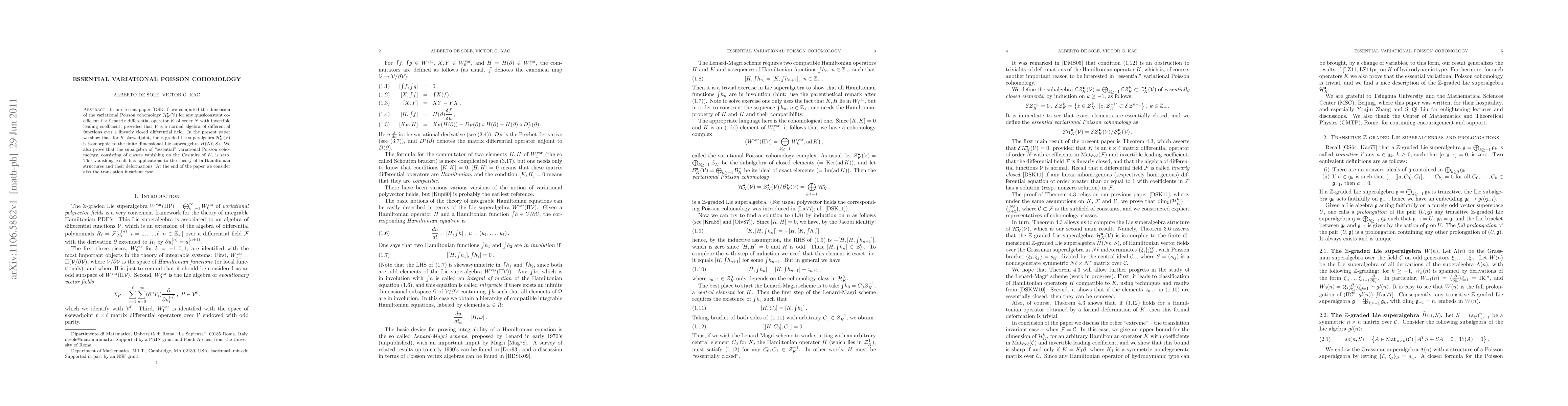 This paper establishes an isomorphism between the variational Poisson cohomology of skewadjoint differential operators and the finite-dimensional Lie superalgebra of Hamiltonian vector fields over a Grassman algebra. It also proves that the essential variational Poisson cohomology, which excludes classes vanishing on Casimirs, is zero, with implications for bi-Hamiltonian structures and their deformations.
