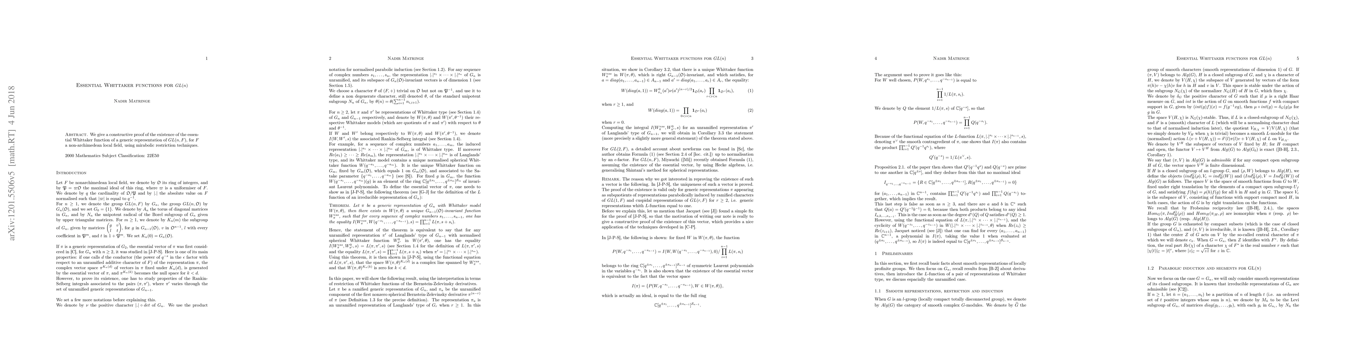 Summary: This paper provides a constructive proof for essential Whittaker functions of the general linear group GL(n,F) through the use of mirabolic restriction, establishing the existence of local new forms.