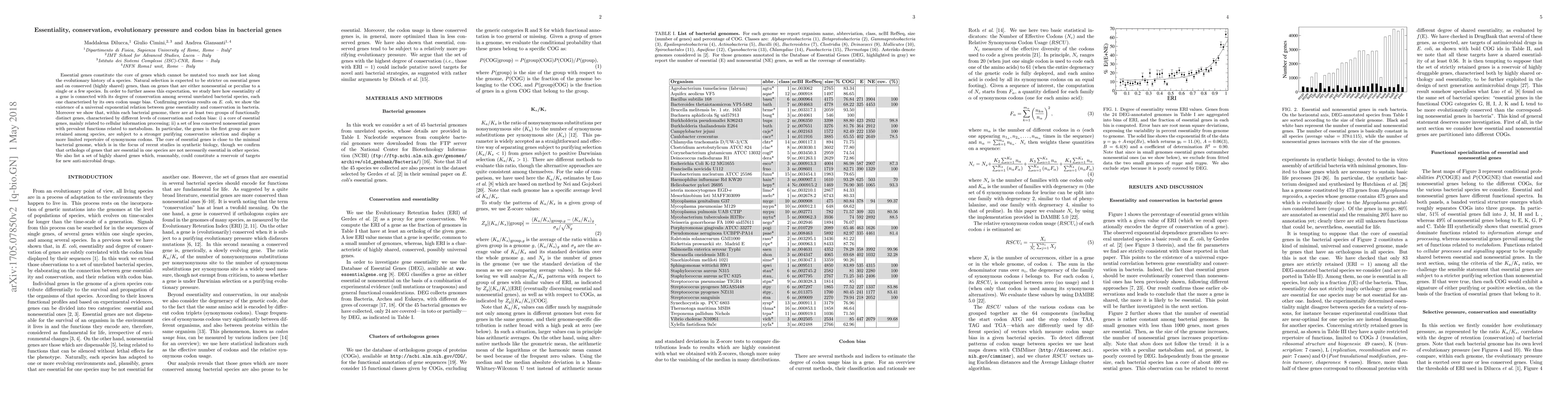 This paper investigates the relationship between gene essentiality, conservation, and codon bias in bacterial genes, revealing a universal exponential link between essentiality and conservation across species. It identifies two distinct gene groups: a core of highly conserved, essential genes involved in information processing, and less conserved, nonessential genes related to metabolism.