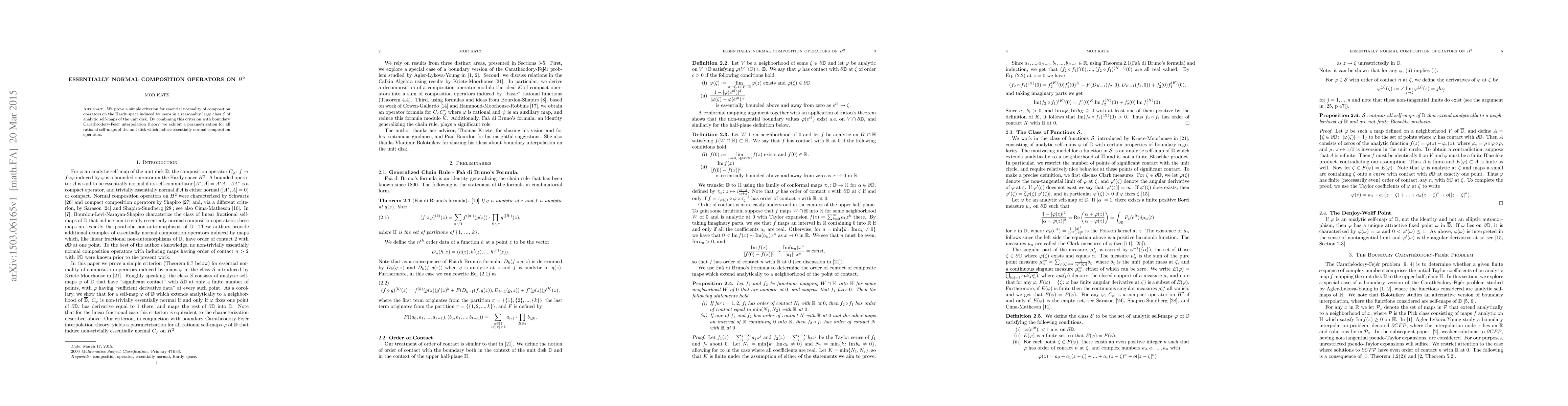 The research employs a criterion for essential normality of composition operators on the Hardy space $H^2$, combining this with boundary Carathéodory-Fejér interpolation theory to parametrize rational self-maps of the unit disk inducing essentially normal composition operators.