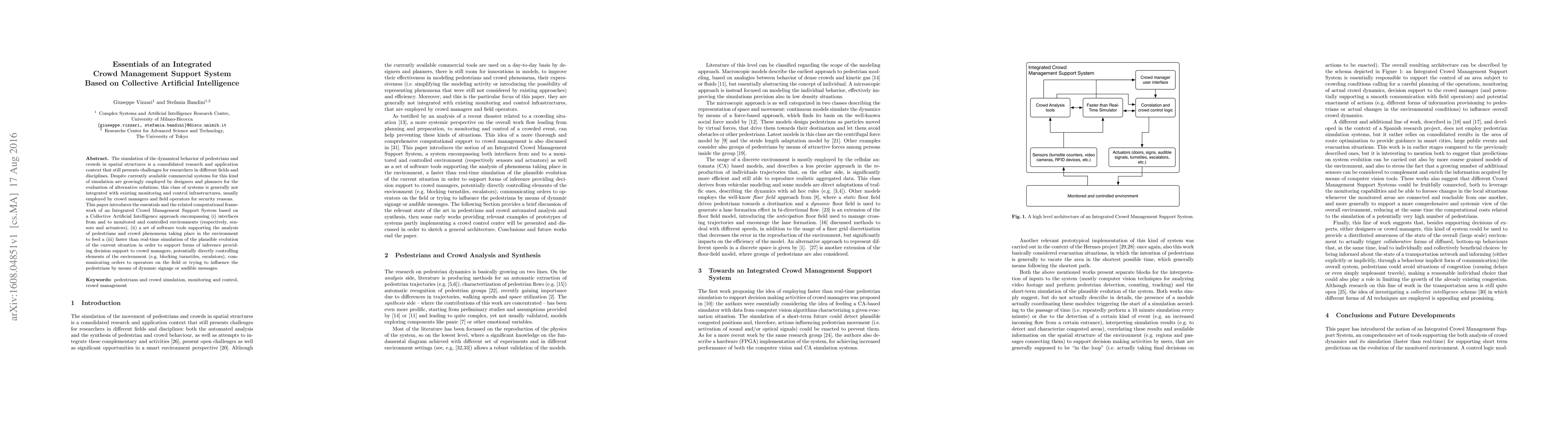 This paper proposes an Integrated Crowd Management Support System using Collective Artificial Intelligence. It includes interfaces with sensors and actuators, software tools for pedestrian and crowd phenomenon analysis, and a faster-than-real-time simulation to support decision-making for crowd managers, potentially controlling environment elements or communicating with field operators or pedestrians.