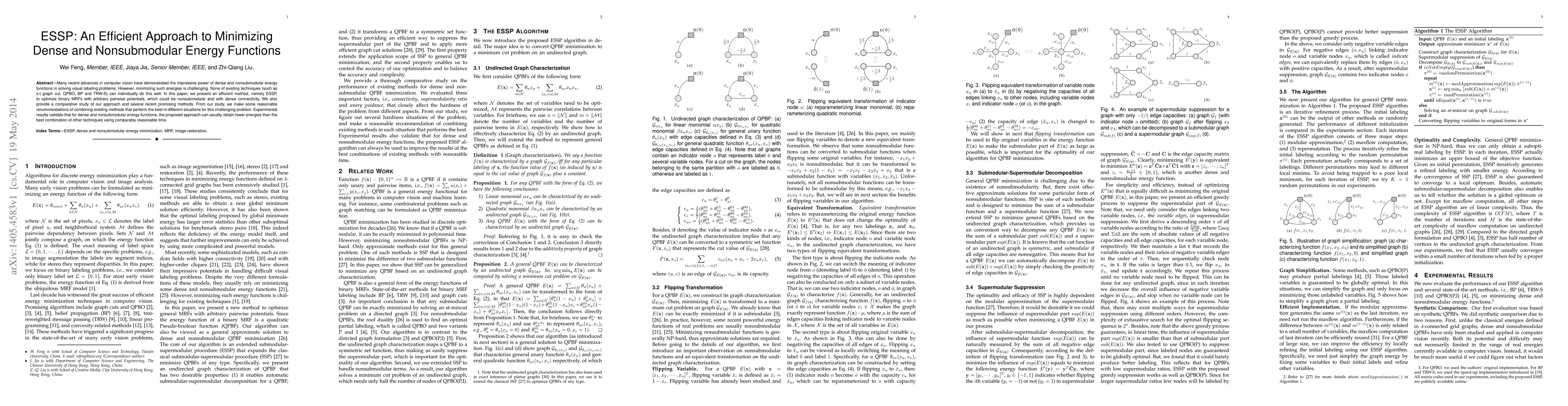 Title: ESSP: An Efficient Approach to Minimizing Dense and Nonsubmodular Energy Functions Summary: This paper introduces ESSP, an efficient method for optimizing binary MRFs with dense and nonsubmodular energy functions, outperforming existing techniques like s-t graph cut and QPBO. Comparative studies show that ESSP achieves lower energies in reasonable time, recommending its use for challenging visual labeling problems.