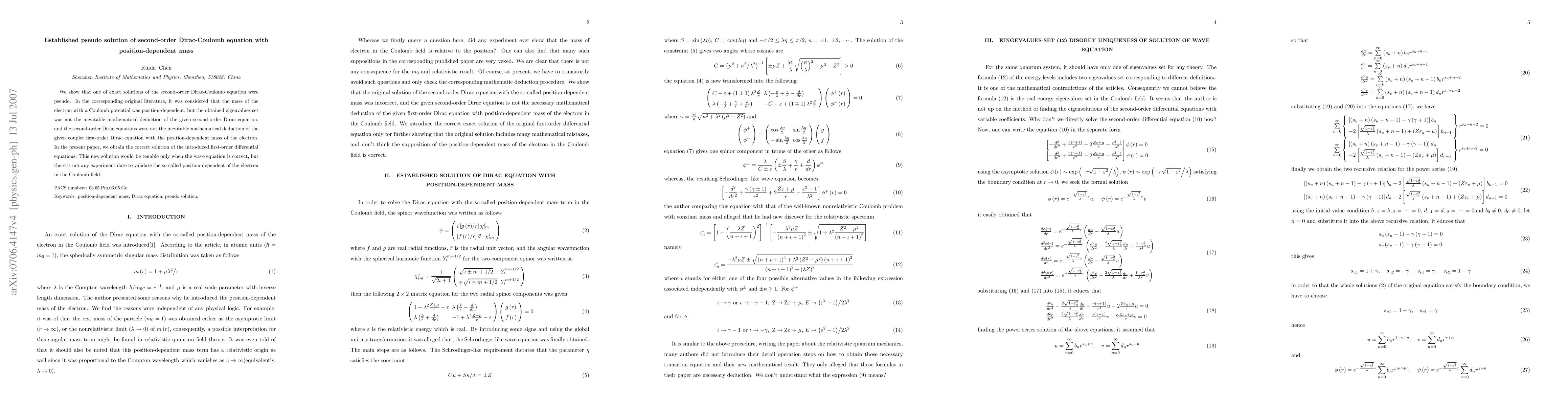 We show that one of exact solutions of the second-order Dirac-Coulomb equation were pseudo. In the corresponding original literature, it was considered that the mass of the electron with a Coulomb potential was position-dependent, but the obtained eigenvalues set was not the inevitable mathematical deduction of the given second-order Dirac equation, and the second-order Dirac equations were not the inevitable mathematical deduction of the given couplet first-order Dirac equation with the position-dependent mass of the electron. In the present paper, we obtain the correct solution of the introduced first-order differential equations. This new solution would be tenable only when the wave equation is correct, but there is not any experiment date to validate the so-called position-dependent of the electron in the Coulomb field.