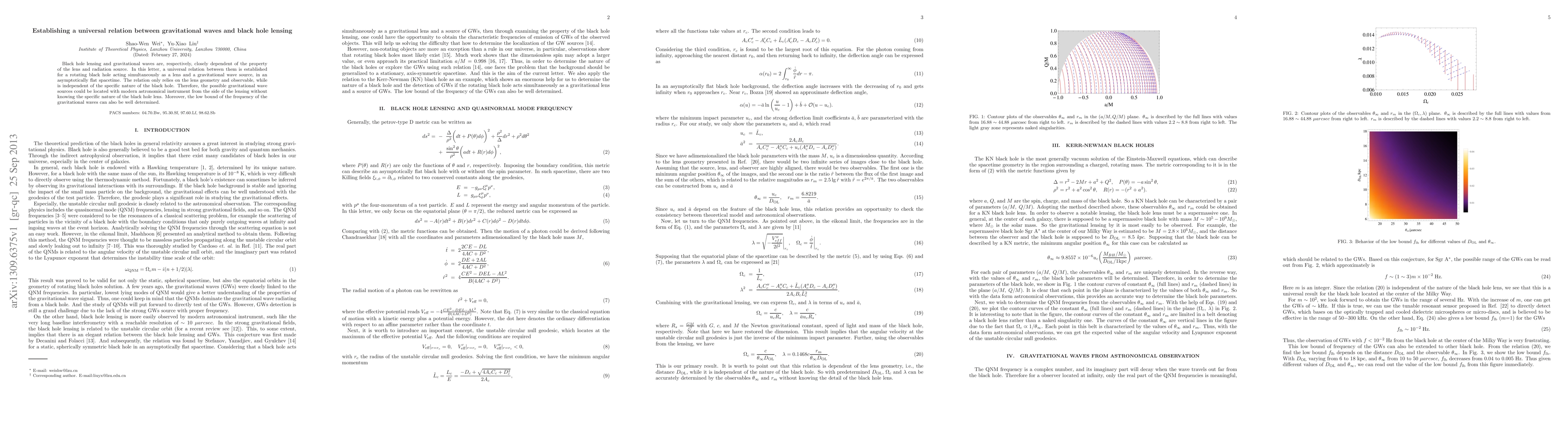 This paper establishes a universal relation between gravitational waves and black hole lensing, showing that a rotating black hole can act as both a lens and a gravitational wave source in an asymptotically flat spacetime. The relation depends solely on lens geometry and observables, allowing for the localization of gravitational wave sources via lensing without needing detailed black hole properties.