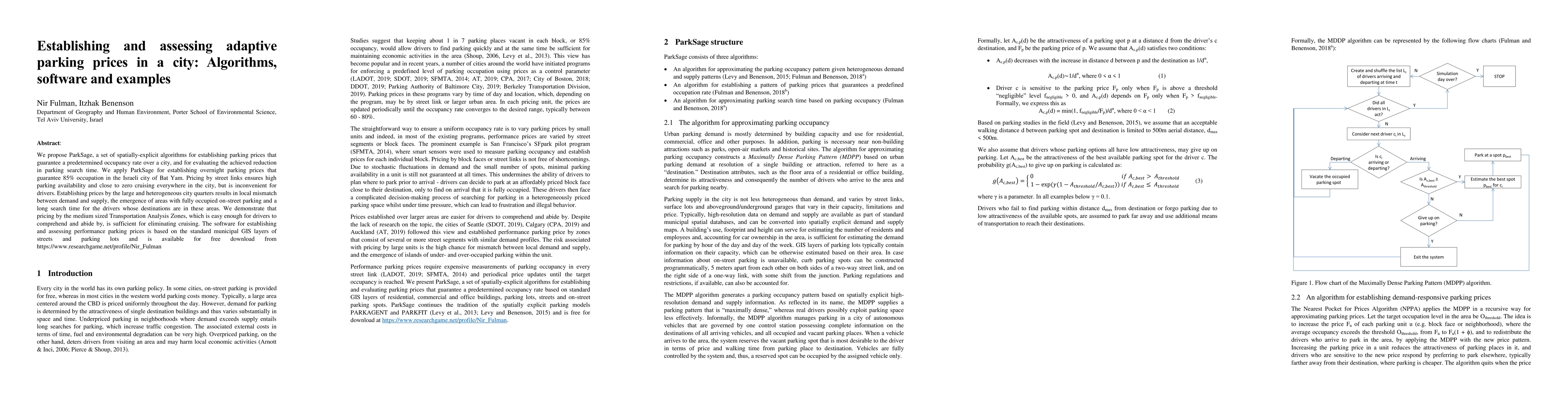 We propose ParkSage, a set of spatially-explicit algorithms for establishing parking prices that guarantee a predetermined occupancy rate over a city, and for evaluating the achieved reduction in parking search time. We apply ParkSage for establishing overnight parking prices that guarantee 85% occupation in the Israeli city of Bat Yam. Pricing by street links ensures high parking availability and close to zero cruising everywhere in the city, but is inconvenient for drivers. Establishing prices by the large and heterogeneous city quarters results in local mismatch between demand and supply, the emergence of areas with fully occupied on-street parking and a long search time for the drivers whose destinations are in these areas. We demonstrate that pricing by the medium sized Transportation Analysis Zones, which is easy enough for drivers to comprehend and abide by, is sufficient for eliminating cruising. The software for establishing and assessing performance parking prices is based on the standard municipal GIS layers of streets and parking lots and is available for free download from https://www.researchgame.net/profile/Nir_Fulman
