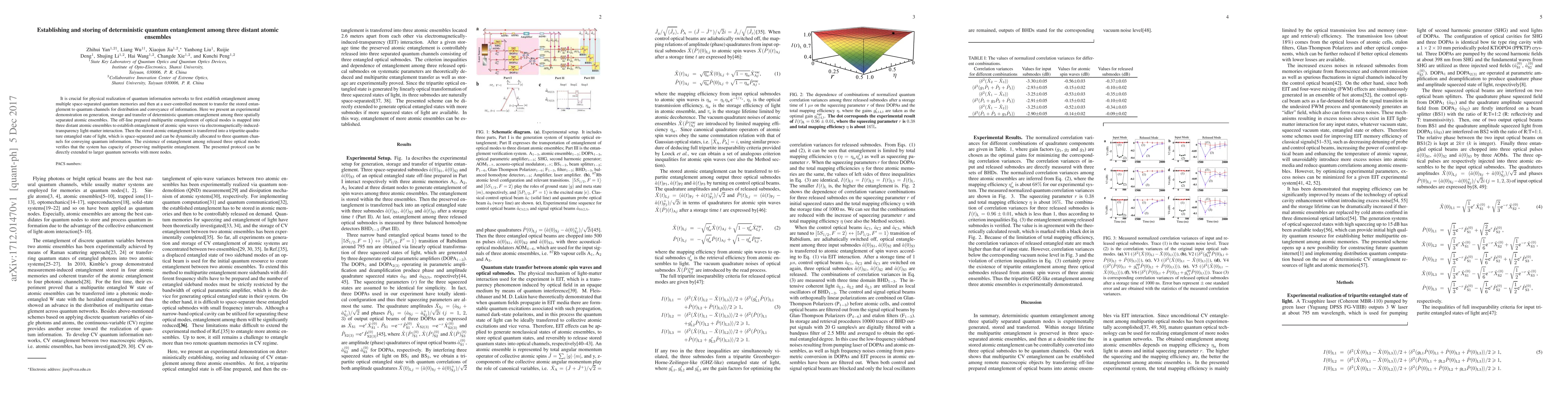 This paper demonstrates the generation, storage, and transfer of deterministic quantum entanglement among three distant atomic ensembles. The multipartite entanglement is mapped into atomic spin waves and later transferred to light, verifying the system's capacity for preserving multipartite entanglement and paving the way for scalable quantum networks.