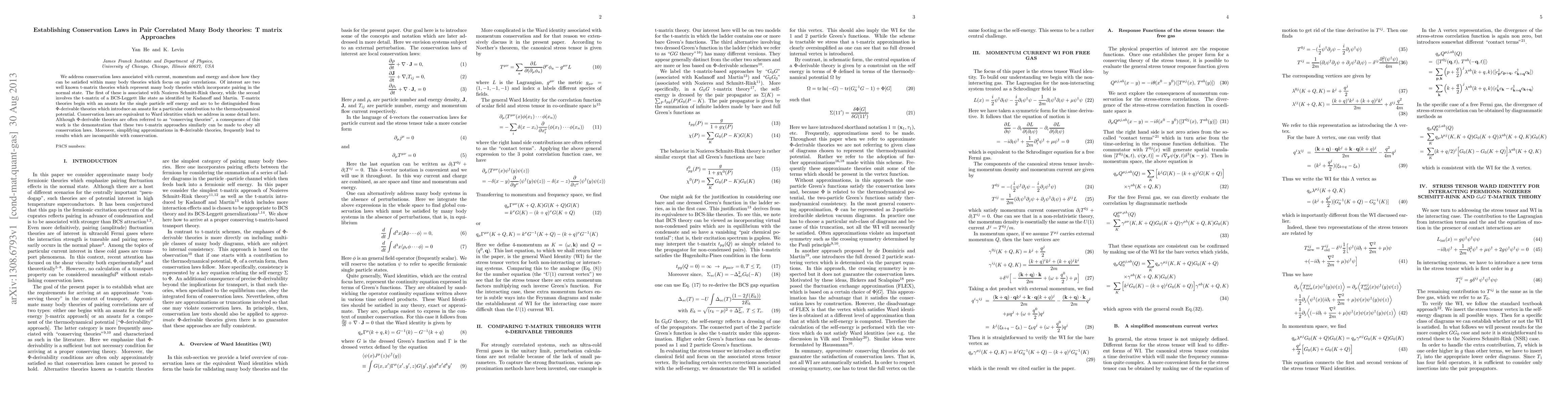 We address conservation laws associated with current, momentum and energy and show how they can be satisfied within many body theories which focus on pair correlations. Of interest are two well known t-matrix theories which represent many body theories which incorporate pairing in the normal state. The first of these is associated with Nozieres Schmitt-Rink theory, while the second involves the t-matrix of a BCS-Leggett like state as identified by Kadanoff and Martin. T-matrix theories begin with an ansatz for the single particle self energy and are to be distinguished from $\Phi$-derivable theories which introduce an ansatz for a particular contribution to the thermodynamical potential. Conservation laws are equivalent to Ward identities which we address in some detail here. Although $\Phi$-derivable theories are often referred to as "conserving theories", a consequence of this work is the demonstration that these two t-matrix approaches similarly can be made to obey all conservation laws. Moreover, simplifying approximations in $\Phi$-derivable theories, frequently lead to results which are incompatible with conservation.
