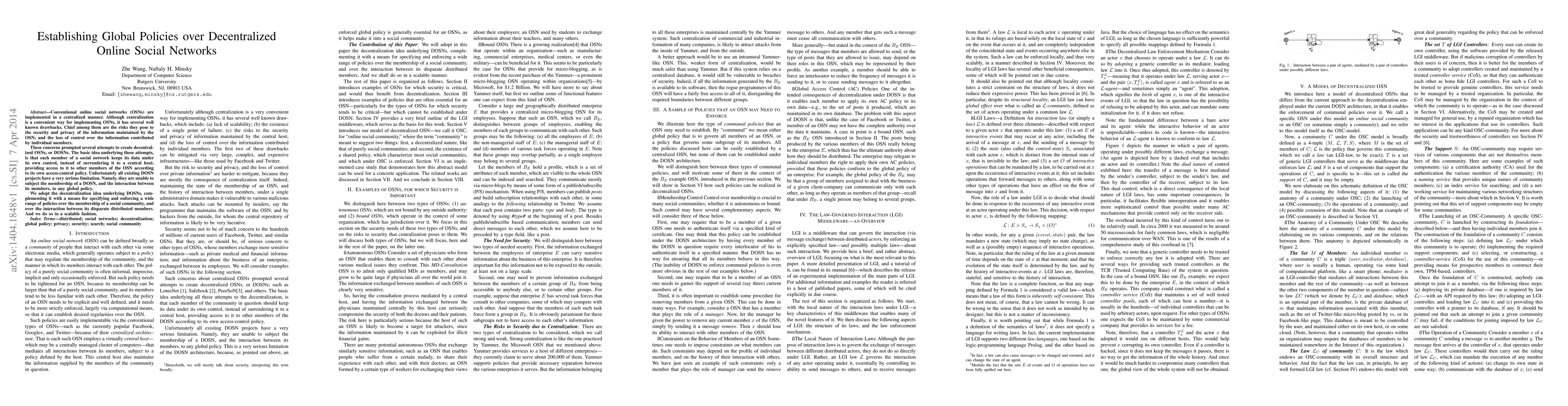 Conventional online social networks (OSNs) are implemented in a centralized manner. Although centralization is a convenient way for implementing OSNs, it has several well known drawbacks. Chief among them are the risks they pose to the security and privacy of the information maintained by the OSN; and the loss of control over the information contributed by individual members. These concerns prompted several attempts to create decentralized OSNs, or DOSNs. The basic idea underlying these attempts, is that each member of a social network keeps its data under its own control, instead of surrendering it to a central host; providing access to it to other members of the OSN according to its own access-control policy. Unfortunately all existing DOSN projects have a very serious limitation. Namely, they are unable to subject the membership of a DOSN, and the interaction between its members, to any global policy. We adopt the decentralization idea underlying DOSNs, complementing it with a means for specifying and enforcing a wide range of policies over the membership of a social community, and over the interaction between its disparate distributed members. And we do so in a scalable fashion.