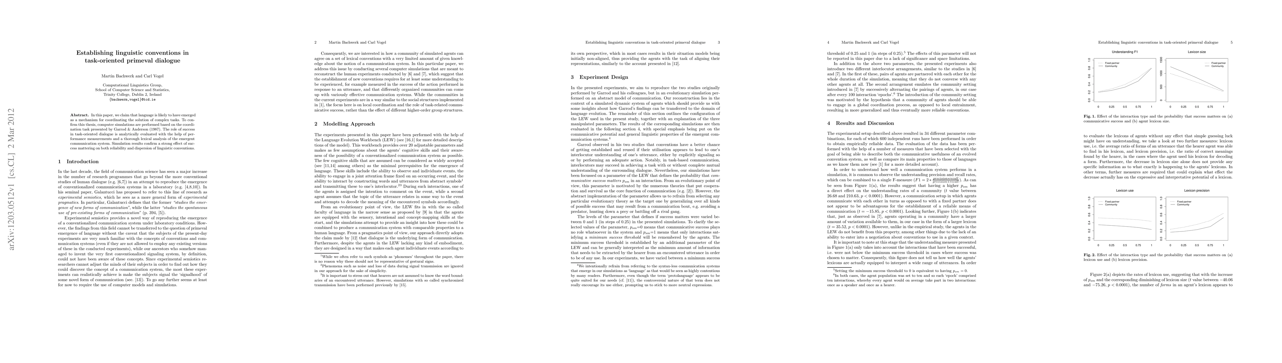 This paper argues that language likely evolved to coordinate complex task solutions, supported by computer simulations based on Garrod & Anderson's coordination task. Results show that task success significantly influences the reliability and dispersion of emerging linguistic conventions.