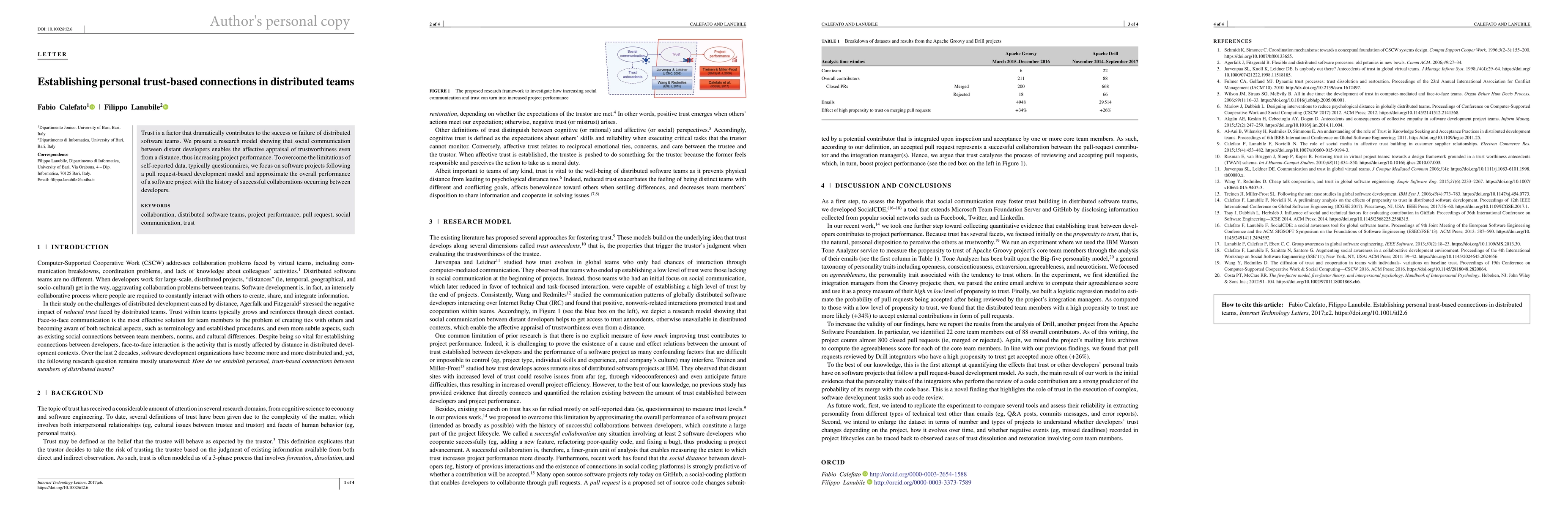 This research model reveals that social communication among remote software developers fosters trust, enhancing project performance. It measures this trust through successful collaboration histories, rather than relying solely on self-reported data.