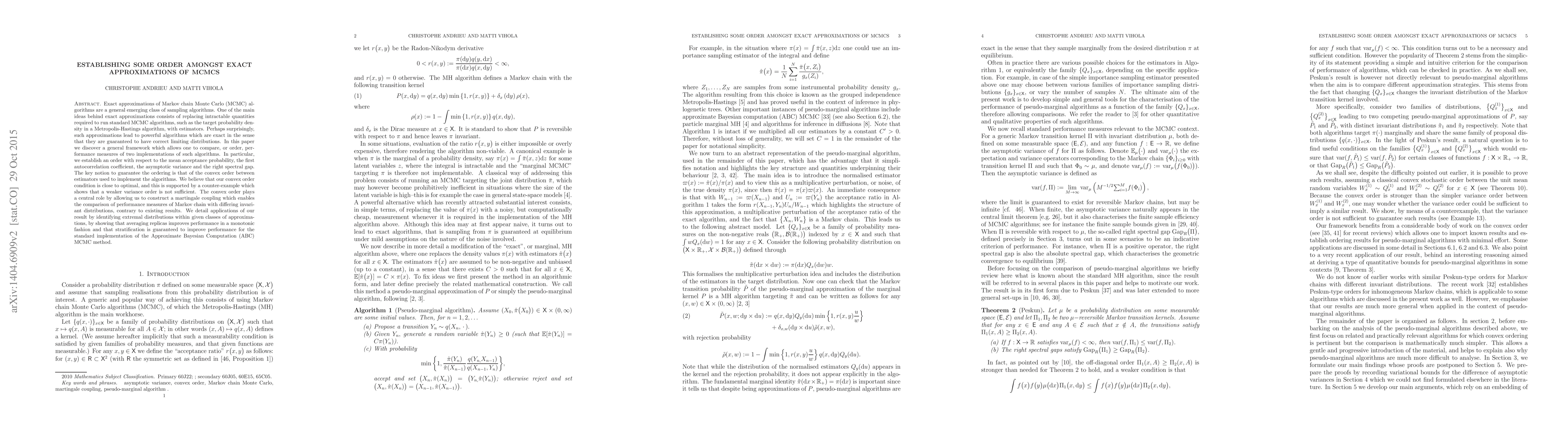 Exact approximations of Markov chain Monte Carlo (MCMC) algorithms are a general emerging class of sampling algorithms. One of the main ideas behind exact approximations consists of replacing intractable quantities required to run standard MCMC algorithms, such as the target probability density in a Metropolis-Hastings algorithm, with estimators. Perhaps surprisingly, such approximations lead to powerful algorithms which are exact in the sense that they are guaranteed to have correct limiting distributions. In this paper we discover a general framework which allows one to compare, or order, performance measures of two implementations of such algorithms. In particular, we establish an order with respect to the mean acceptance probability, the first autocorrelation coefficient, the asymptotic variance and the right spectral gap. The key notion to guarantee the ordering is that of the convex order between estimators used to implement the algorithms. We believe that our convex order condition is close to optimal, and this is supported by a counter-example which shows that a weaker variance order is not sufficient. The convex order plays a central role by allowing us to construct a martingale coupling which enables the comparison of performance measures of Markov chain with differing invariant distributions, contrary to existing results. We detail applications of our result by identifying extremal distributions within given classes of approximations, by showing that averaging replicas improves performance in a monotonic fashion and that stratification is guaranteed to improve performance for the standard implementation of the Approximate Bayesian Computation (ABC) MCMC method.