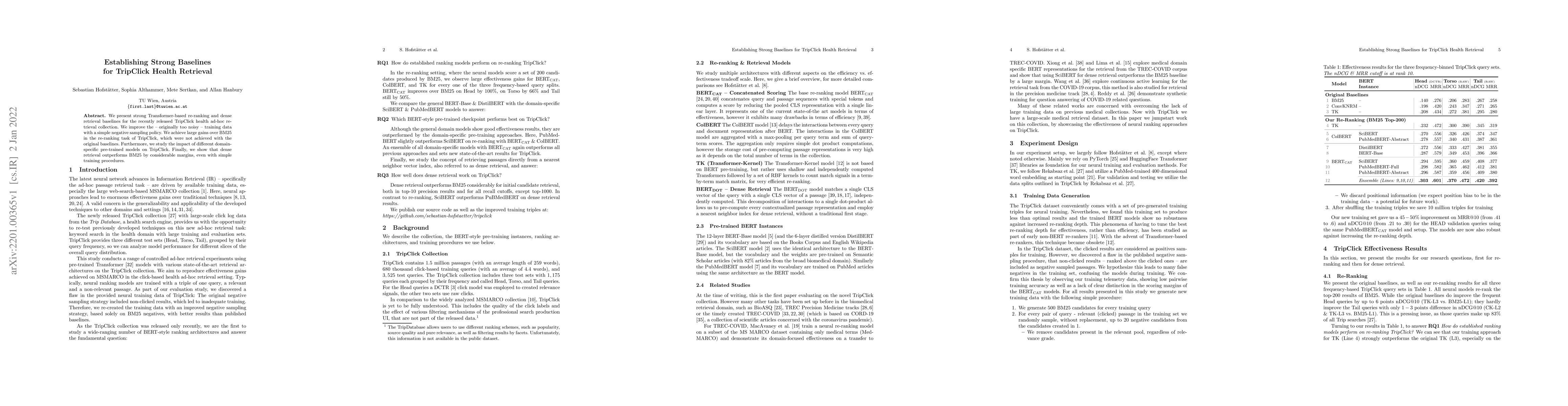 This paper establishes strong Transformer-based baselines for TripClick health ad-hoc retrieval, improving noisy training data with negative sampling. It demonstrates significant improvements over BM25 in re-ranking and shows dense retrieval outperforms BM25 substantially.
