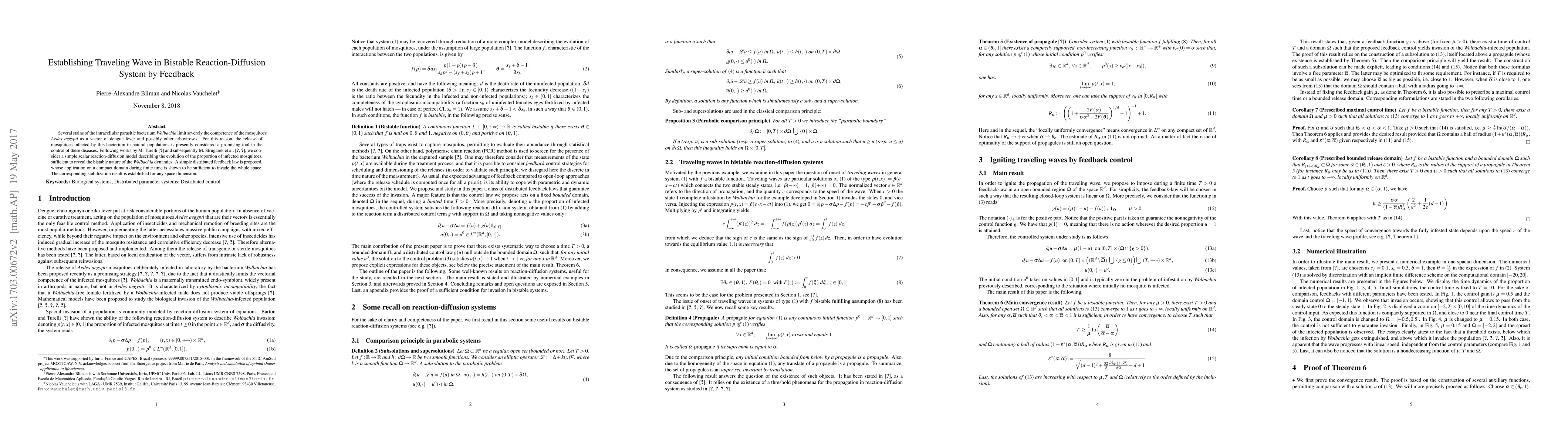 The paper presents a novel approach using feedback control to ensure the invasion of a bistable reaction-diffusion system, providing theoretical guarantees for the establishment of traveling waves in the context of disease vector control.