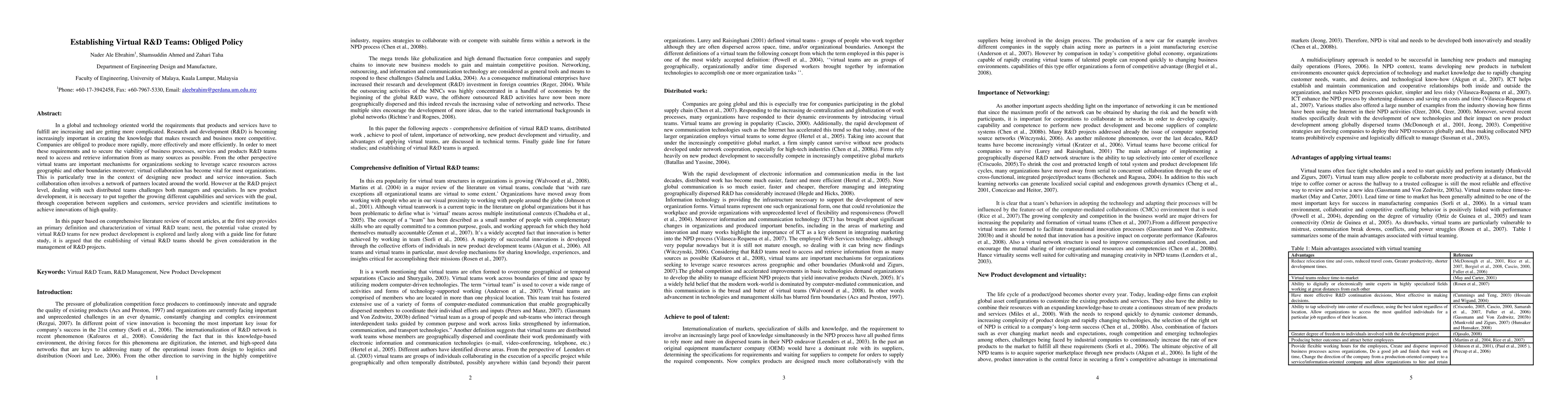This paper defines and characterizes virtual R&D teams, explores their value in new product development, and argues for their establishment in R&D project management to enhance competitiveness and innovation. It concludes with guidelines for future research on this topic.