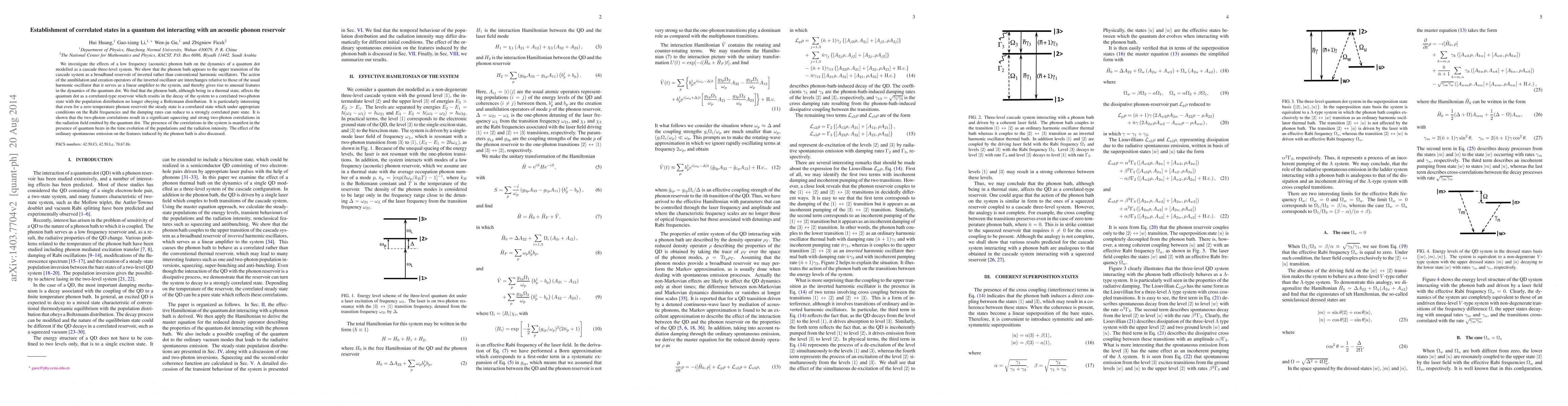 We investigate the effects of a low frequency (acoustic) phonon bath on the dynamics of a quantum dot modelled as a cascade three-level system. We show that the phonon bath appears to the upper transition of the cascade system as a broadband reservoir of inverted rather than conventional harmonic oscillators. The action of the annihilation and creation operators of the inverted oscillator are interchanges relative to those of the usual harmonic oscillator that it serves as a linear amplifier to the system, and thereby gives rise to unusual features in the dynamics of the quantum dot. We find that the phonon bath, although being in a thermal state, affects the quantum dot as a correlated-type reservoir which results in the decay of the system to a correlated two-photon state with the population distribution no longer obeying a Boltzmann distribution. It is particularly interesting that even for a zero temperature phonon reservoir the steady state is a correlated state which under appropriate conditions on the Rabi frequencies and the damping rates can reduce to a strongly correlated pure state. It is shown that the two-photon correlations result in a significant squeezing and strong two-photon correlations in the radiation field emitted by the quantum dot. The presence of the correlations in the system is manifest in the presence of quantum beats in the time evolution of the populations and the radiation intensity. The effect of the ordinary spontaneous emission on the features induced by the phonon bath is also discussed.