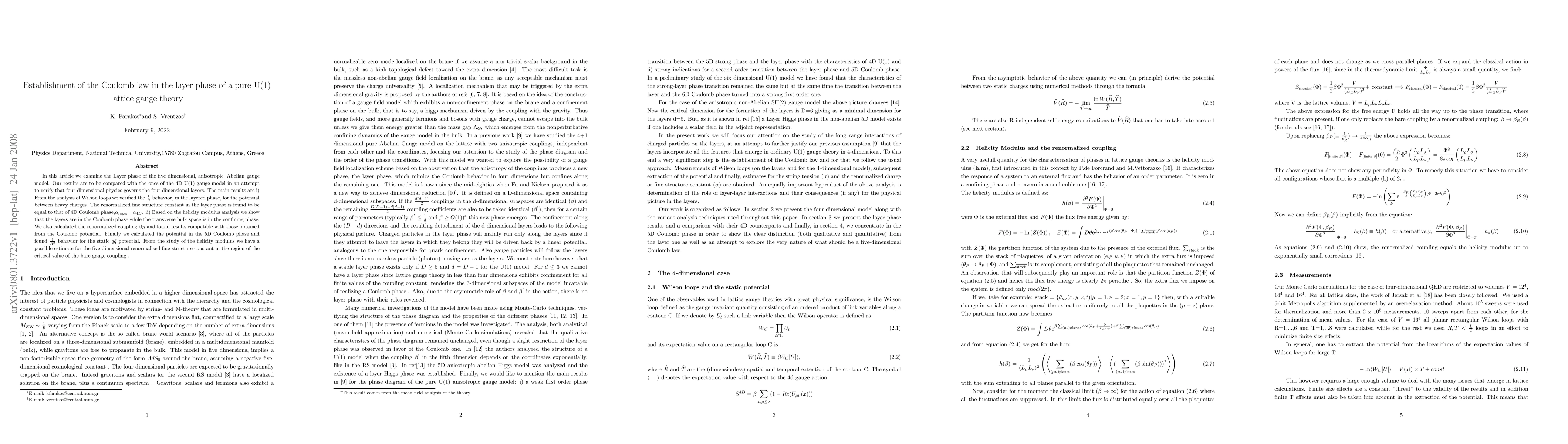 In this article we examine the Layer phase of the five dimensional, anisotropic, Abelian gauge model. Our results are to be compared with the ones of the 4D U(1) gauge model in an attempt to verify that four dimensional physics governs the four dimensional layers. The main results are: i) From the analysis of Wilson loops we verified the $\frac{1}{R}$ behavior, in the layered phase, for the potential between heavy charges. The renormalized fine structure constant in the layer phase is found to be equal to that of 4D Coulomb phase,$\alpha_{layer}$=$\alpha_{4D}$. ii) Based on the helicity modulus analysis we show that the layers are in the Coulomb phase while the transverse bulk space is in the confining phase. We also calculated the renormalized coupling $\beta_{R}$ and found results compatible with those obtained from the Coulomb potential. Finally we calculated the potential in the 5D Coulomb phase and found $\frac{1}{R^{2}}$ behavior for the static $q \bar{q}$ potential. From the study of the helicity modulus we have a possible estimate for the five dimensional renormalized fine structure constant in the region of the critical value of the bare gauge coupling.