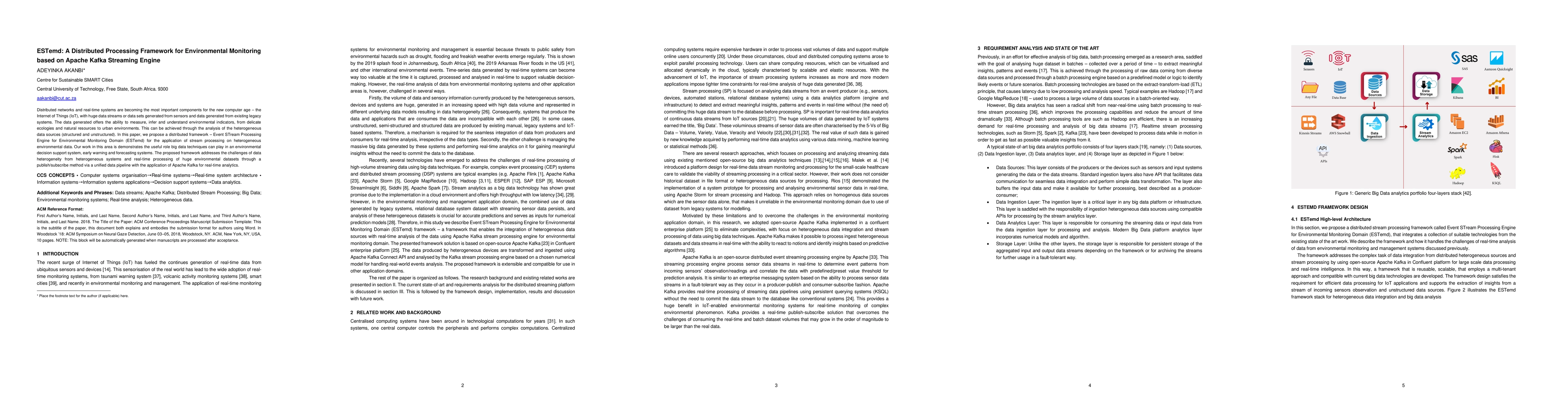 The paper proposes ESTemd, a distributed processing framework leveraging Apache Kafka for real-time analytics of heterogeneous environmental data streams. It aims to enhance environmental monitoring and decision support systems through efficient handling of large, diverse datasets.