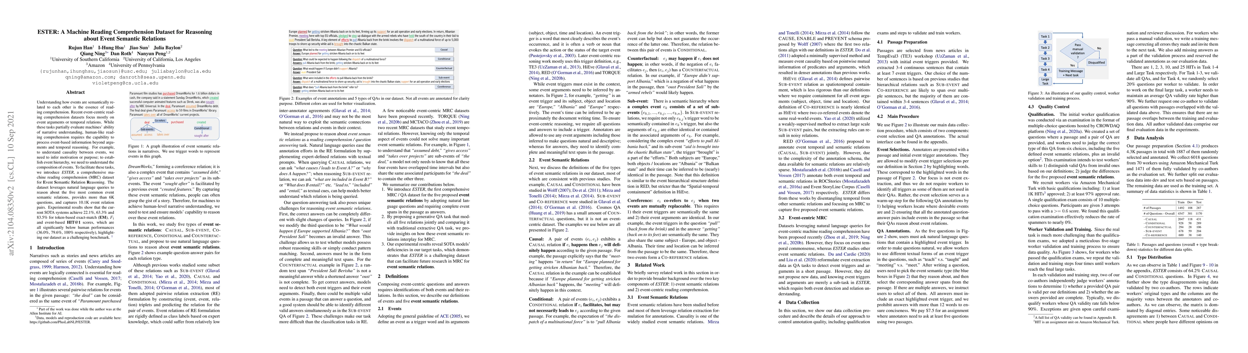 ESTER is a new machine reading comprehension dataset designed to test event semantic relation reasoning, encompassing five common event relations and over 10,000 event pairs. Current state-of-the-art systems perform poorly compared to human capabilities, indicating a significant challenge for advancing machine comprehension.
