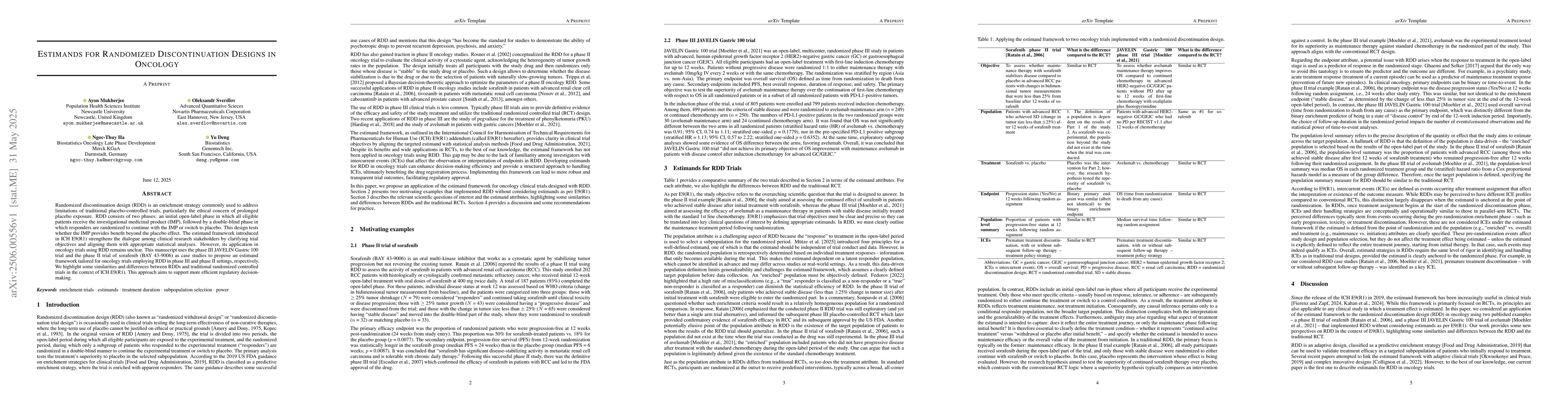 The manuscript proposes an estimand framework for oncology trials using Randomized Discontinuation Designs (RDD) by employing case studies from the JAVELIN Gastric 100 (phase III) and sorafenib (BAY 43-9006, phase II) trials, aligning with ICH E9(R1) guidelines.