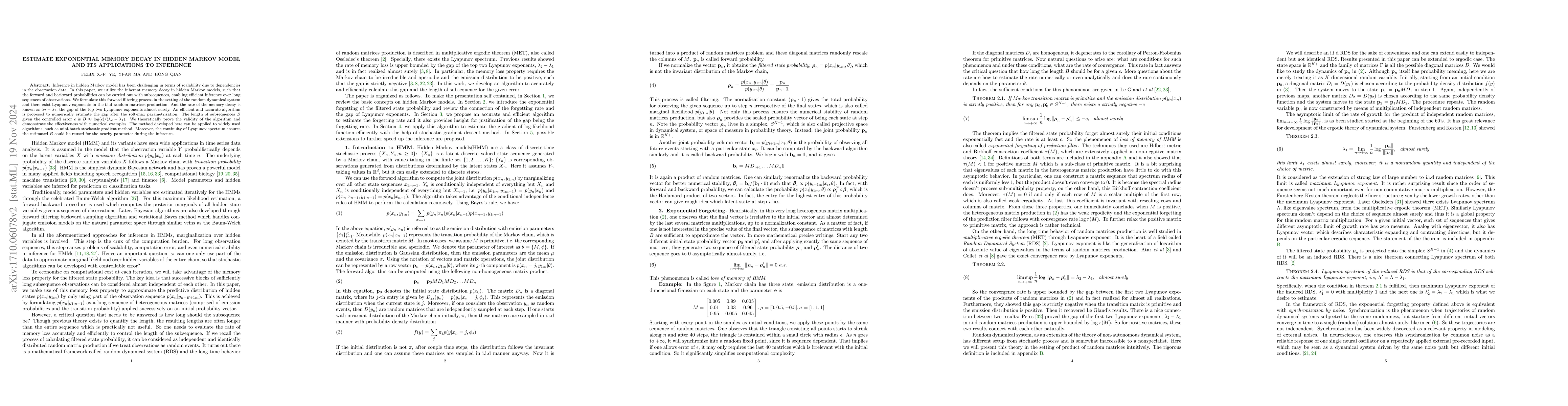 Inference in hidden Markov model has been challenging in terms of scalability due to dependencies in the observation data. In this paper, we utilize the inherent memory decay in hidden Markov models, such that the forward and backward probabilities can be carried out with subsequences, enabling efficient inference over long sequences of observations. We formulate this forward filtering process in the setting of the random dynamical system and there exist Lyapunov exponents in the i.i.d random matrices production. And the rate of the memory decay is known as $\lambda_2-\lambda_1$, the gap of the top two Lyapunov exponents almost surely. An efficient and accurate algorithm is proposed to numerically estimate the gap after the soft-max parametrization. The length of subsequences $B$ given the controlled error $\epsilon$ is $B=\log(\epsilon)/(\lambda_2-\lambda_1)$. We theoretically prove the validity of the algorithm and demonstrate the effectiveness with numerical examples. The method developed here can be applied to widely used algorithms, such as mini-batch stochastic gradient method. Moreover, the continuity of Lyapunov spectrum ensures the estimated $B$ could be reused for the nearby parameter during the inference.