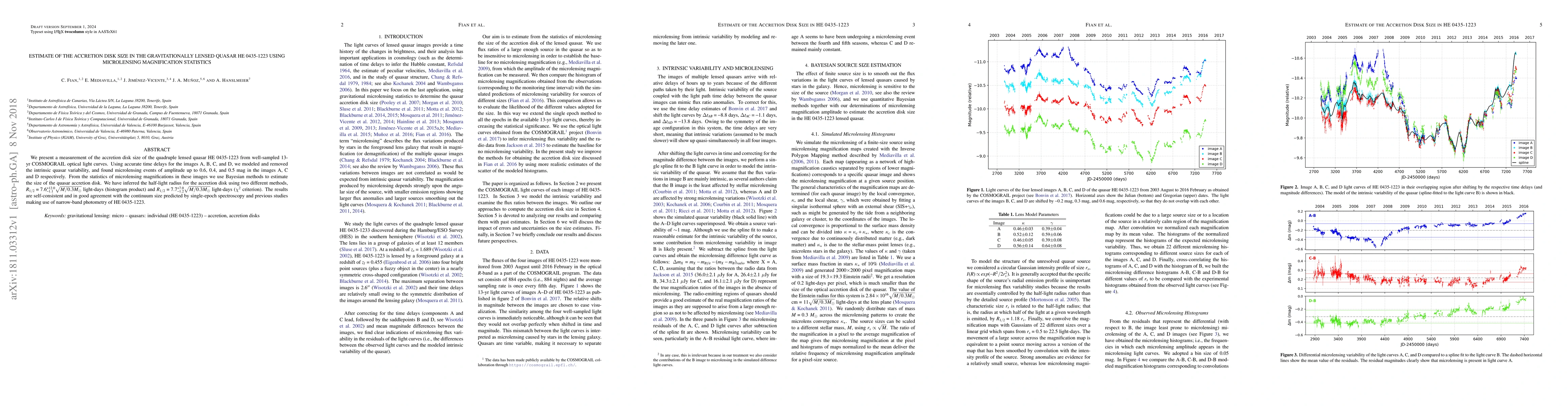 This paper estimates the size of the accretion disk in the gravitationally lensed quasar HE 0435-1223 using microlensing magnification statistics from 13-year COSMOGRAIL light curves. The inferred half-light radius is $R_{1/2} = 7.6_{-1.1}^{+12.0} \sqrt{M/0.3M_{\odot}}$ light-days, consistent with previous predictions.