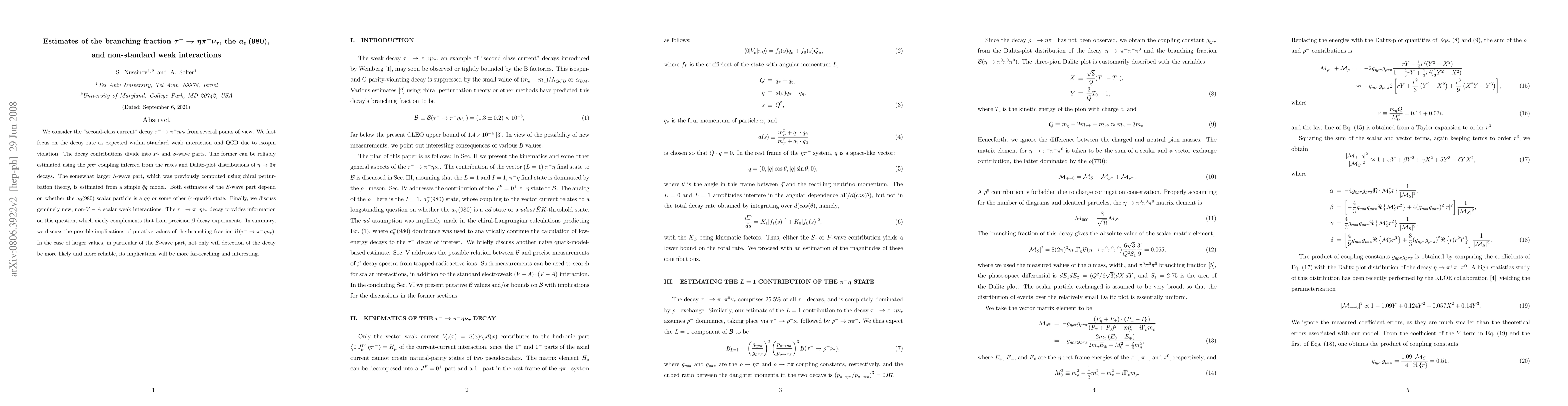 We consider the ``second-class current'' decay $\tau^-\to\pi^-\eta\nu_\tau$ from several points of view. We first focus on the decay rate as expected within standard weak interaction and QCD due to isospin violation. The decay contributions divide into $P$- and $S$-wave parts. The former can be reliably estimated using the $\rho\eta\pi$ coupling inferred from the rates and Dalitz-plot distributions of $\eta\to 3\pi$ decays. The somewhat larger $S$-wave part, which was previously computed using chiral perturbation theory, is estimated from a simple $\bar qq$ model. Both estimates of the $S$-wave part depend on whether the $a_0(980)$ scalar particle is a $\bar qq$ or some other (4-quark) state. Finally, we discuss genuinely new, non-$V-A$ scalar weak interactions. The $\tau^-\to\pi^-\eta\nu_\tau$ decay provides information on this question, which nicely complements that from precision $\beta$ decay experiments. % In summary, we discuss the possible implications of putative values of the branching fraction ${\cal B}(\tau^-\to\pi^-\eta\nu_\tau)$. In the case of larger values, in particular of the $S$-wave part, not only will detection of the decay be more likely and more reliable, its implications will be more far-reaching and interesting.