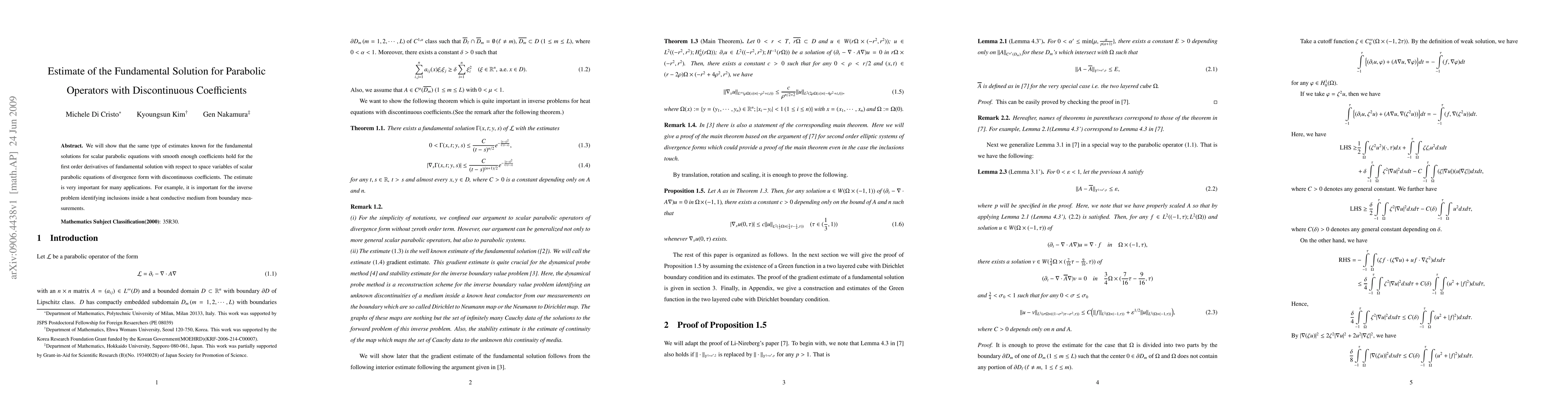 This paper establishes estimates for the fundamental solution of parabolic operators with discontinuous coefficients, showing that these estimates extend to first-order spatial derivatives. Such estimates are crucial for applications like identifying inclusions in heat conductive media from boundary measurements.