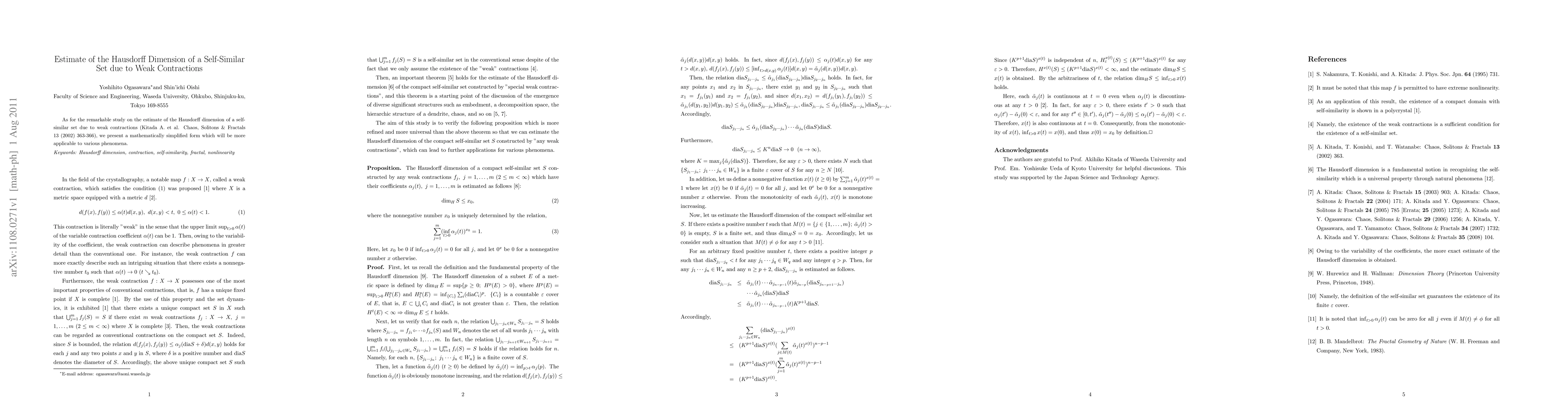 As for the remarkable study on the estimate of the Hausdorff dimension of a self-similar set due to weak contractions (Kitada A. et al. Chaos, Solitons & Fractals 13 (2002) 363-366), we present a mathematically simplified form which will be more applicable to various phenomena.
