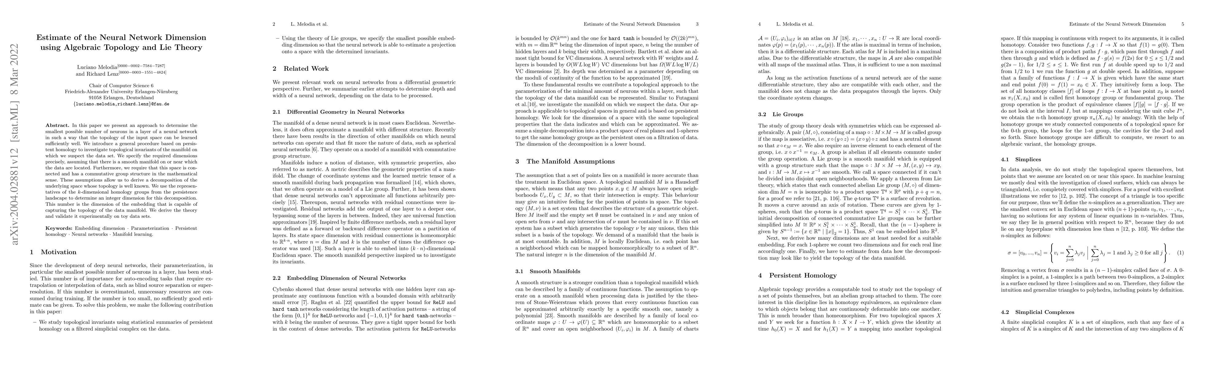 This paper proposes a method to determine the minimum number of neurons in a neural network layer by leveraging algebraic topology and Lie theory. It uses persistent homology to analyze topological invariants and derives the necessary dimension for the embedding space to sufficiently learn the input space's topology. Experimental validation is performed on simple datasets.
