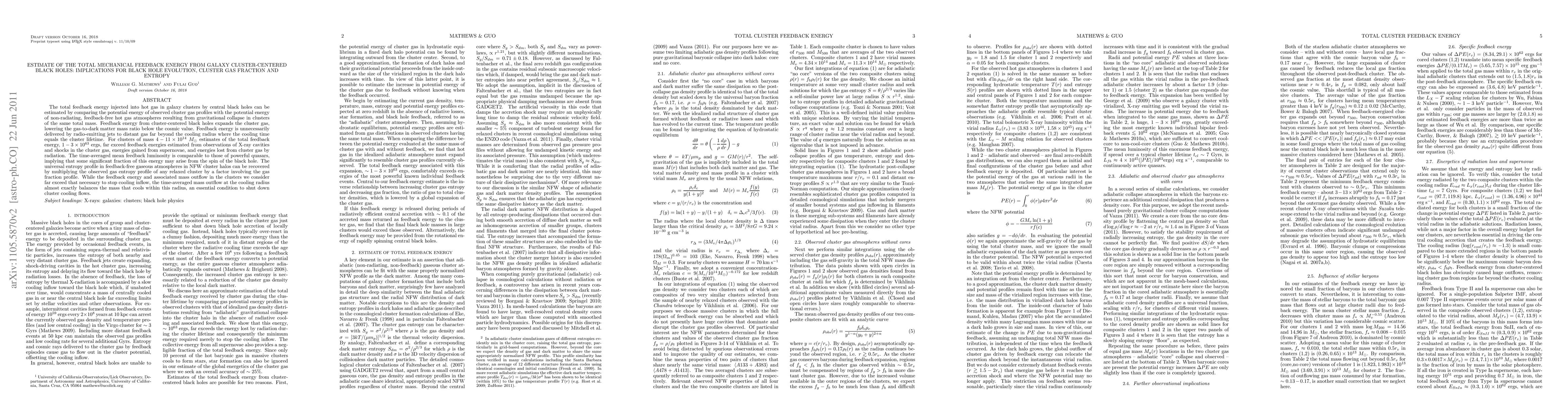 The total feedback energy injected into hot gas in galaxy clusters by central black holes can be estimated by comparing the potential energy of observed cluster gas profiles with the potential energy of non-radiating, feedback-free hot gas atmospheres resulting from gravitational collapse in clusters of the same total mass. Feedback energy from cluster-centered black holes expands the cluster gas, lowering the gas-to-dark matter mass ratio below the cosmic value. Feedback energy is unnecessarily delivered by radio-emitting jets to distant gas far beyond the cooling radius where the cooling time equals the cluster lifetime. For clusters of mass 4-11 X 10^14 Msun estimates of the total feedback energy, 1-3 X 10^63 ergs, far exceed feedback energies estimated from observations of X-ray cavities and shocks in the cluster gas, energies gained from supernovae, and energies lost from cluster gas by radiation. The time-averaged mean feedback luminosity is comparable to those of powerful quasars, implying that some significant fraction of this energy may arise from the spin of the black hole. The universal entropy profile in feedback-free gaseous atmospheres in NFW cluster halos can be recovered by multiplying the observed gas entropy profile of any relaxed cluster by a factor involving the gas fraction profile. While the feedback energy and associated mass outflow in the clusters we consider far exceed that necessary to stop cooling inflow, the time-averaged mass outflow at the cooling radius almost exactly balances the mass that cools within this radius, an essential condition to shut down cluster cooling flows.