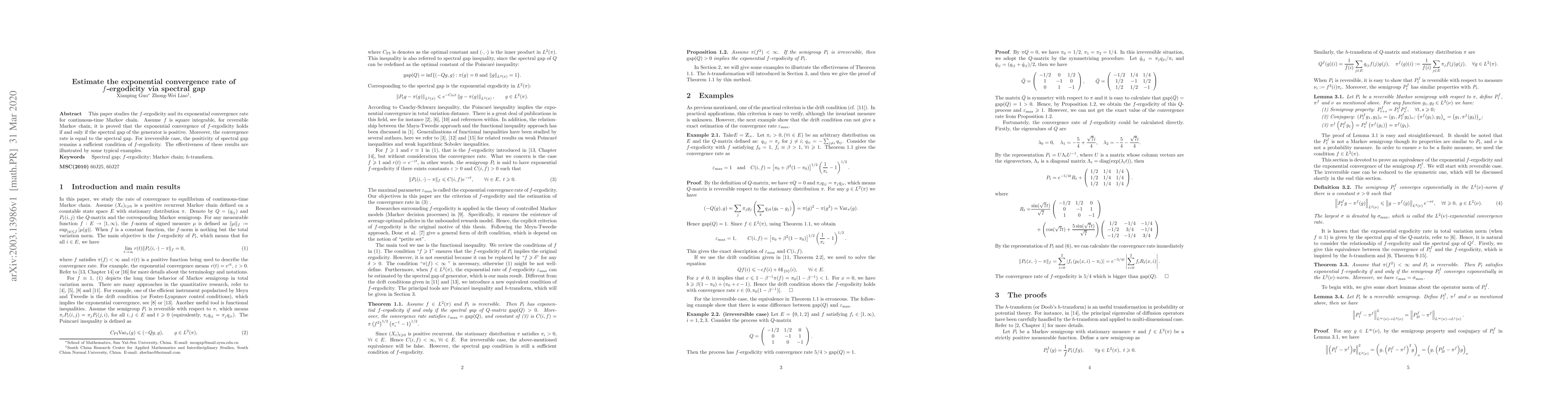 This paper investigates the exponential convergence rate of f-ergodicity in continuous-time Markov chains, showing that for reversible chains, positive spectral gap ensures exponential convergence with the rate equal to the gap. For irreversible chains, a positive spectral gap is sufficient for f-ergodicity, though the convergence rate is not directly quantified.