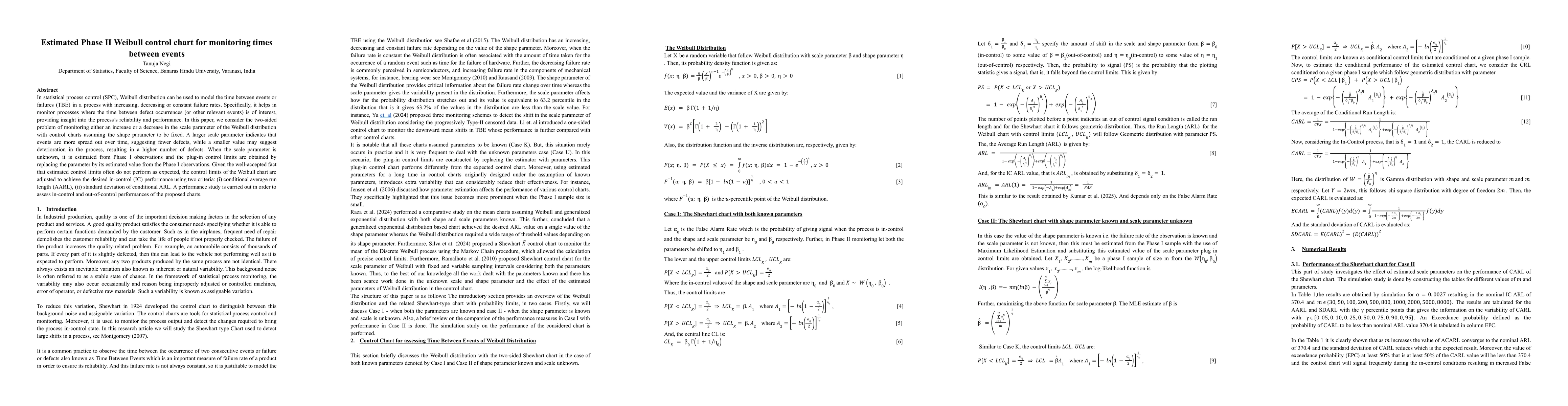 In statistical process control Weibull distribution can be used to model the time between events or failures (TBE) in a process with increasing decreasing or constant failure rates. Specifically it helps in monitoring processes where the time between defect occurrences is of interest providing insight into the process reliability and performance. In this paper we consider the two sided problem of monitoring either an increase or a decrease in the scale parameter of the Weibull distribution with control charts assuming the shape parameter to be fixed. A larger scale parameter indicates that events are more spread out over time suggesting fewer defects while a smaller value may suggest deterioration in the process resulting in a higher number of defects. When the scale parameter is unknown it is estimated from Phase I observations and the plug in control limits are obtained by replacing the parameter by its estimated value from the Phase I observations. Given the well accepted fact that estimated control limits often do not perform as expected, the control limits of the Weibull chart are adjusted to achieve the desired in control (IC) performance using two criteria that are conditional average run length and standard deviation of conditional ARL. A performance study is carried out in order to assess in control and out of control performances of the proposed charts.