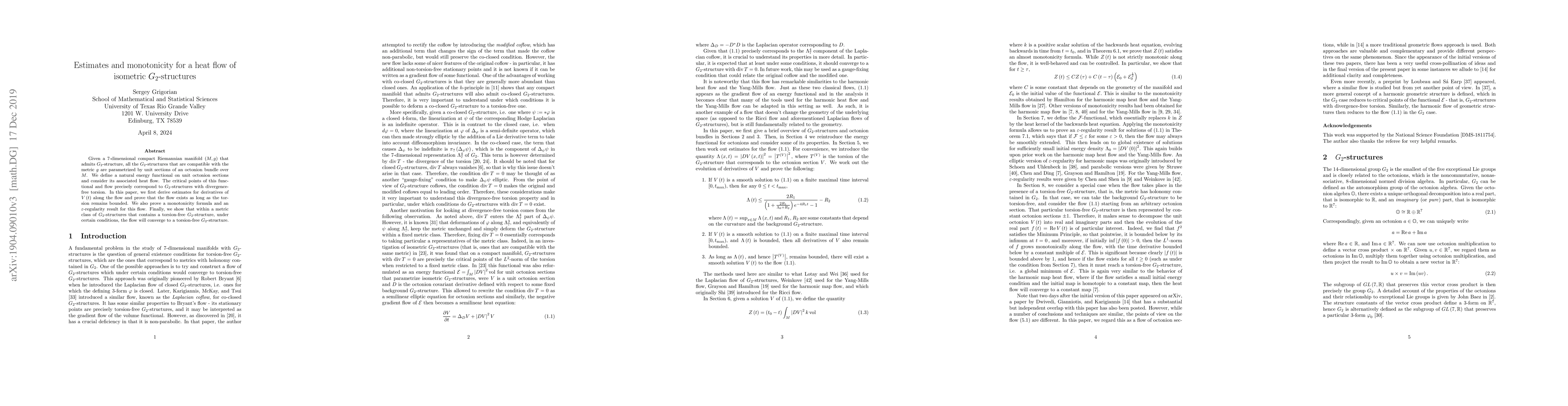Given a $7$-dimensional compact Riemannian manifold $\left( M,g\right) $ that admits $G_{2}$-structure, all the $G_{2}$-structures that are compatible with the metric $g$ are parametrized by unit sections of an octonion bundle over $M$. We define a natural energy functional on unit octonion sections and consider its associated heat flow. The critical points of this functional and flow precisely correspond to $G_{2}$-structures with divergence-free torsion. In this paper, we first derive estimates for derivatives of $V\left( t\right) $ along the flow and prove that the flow exists as long as the torsion remains bounded. We also prove a monotonicity formula and and an $\varepsilon $-regularity result for this flow. Finally, we show that within a metric class of $G_{2}$-structures that contains a torsion-free $G_{2}$-structure, under certain conditions, the flow will converge to a torsion-free $G_{2}$-structure.