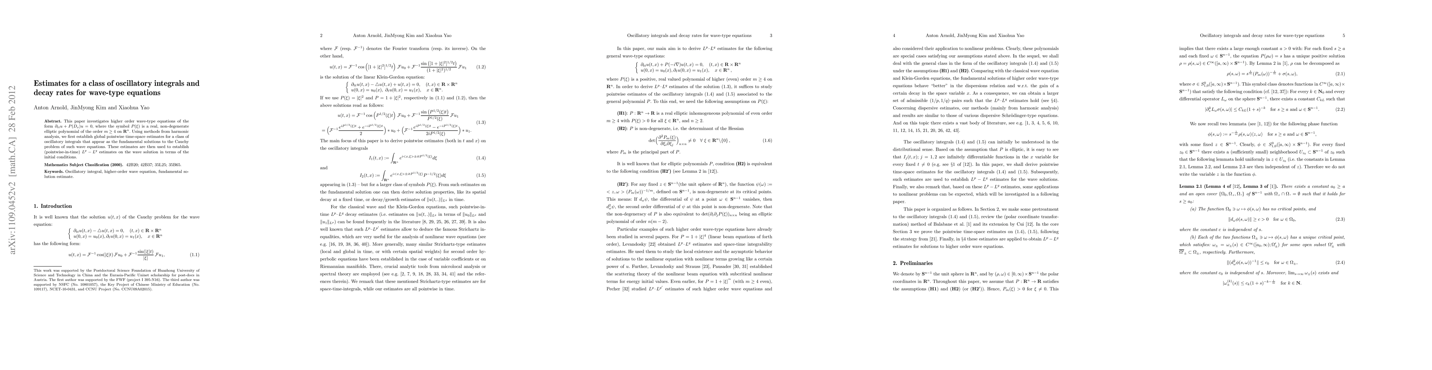This paper investigates higher order wave-type equations of the form $\partial_{tt}u+P(D_{x})u=0$, where the symbol $P(\xi)$ is a real, non-degenerate elliptic polynomial of the order $m\ge4$ on ${\bf R}^n$. Using methods from harmonic analysis, we first establish global pointwise time-space estimates for a class of oscillatory integrals that appear as the fundamental solutions to the Cauchy problem of such wave equations. These estimates are then used to establish (pointwise-in-time) $L^p-L^q$ estimates on the wave solution in terms of the initial conditions.