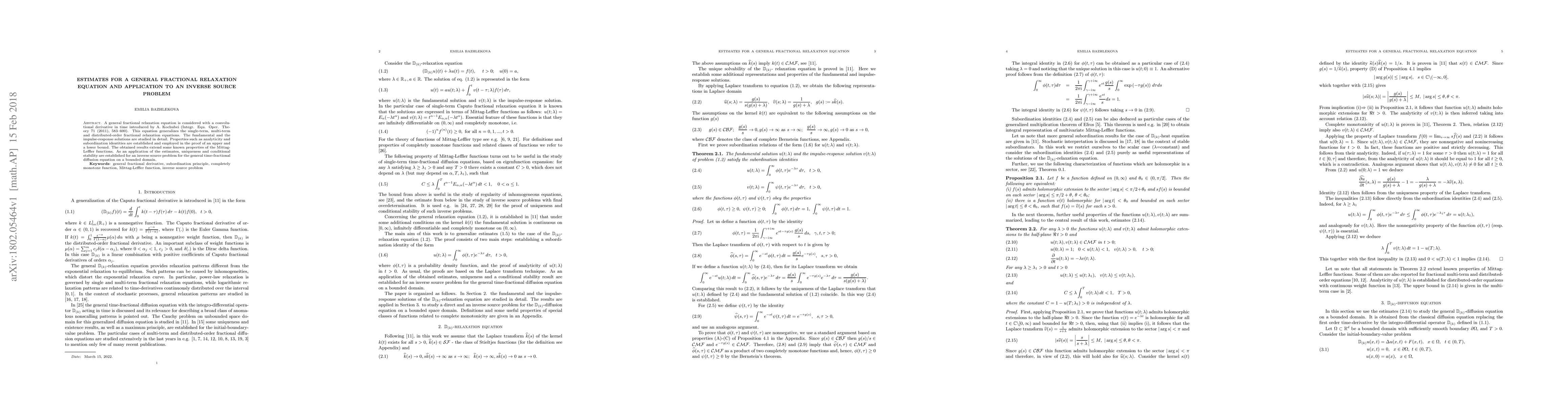 This paper studies a general fractional relaxation equation with convolutional derivatives, deriving fundamental and impulse-response solutions, and establishing analyticity and subordination identities. The results are applied to prove uniqueness and conditional stability for an inverse source problem in time-fractional diffusion equations.