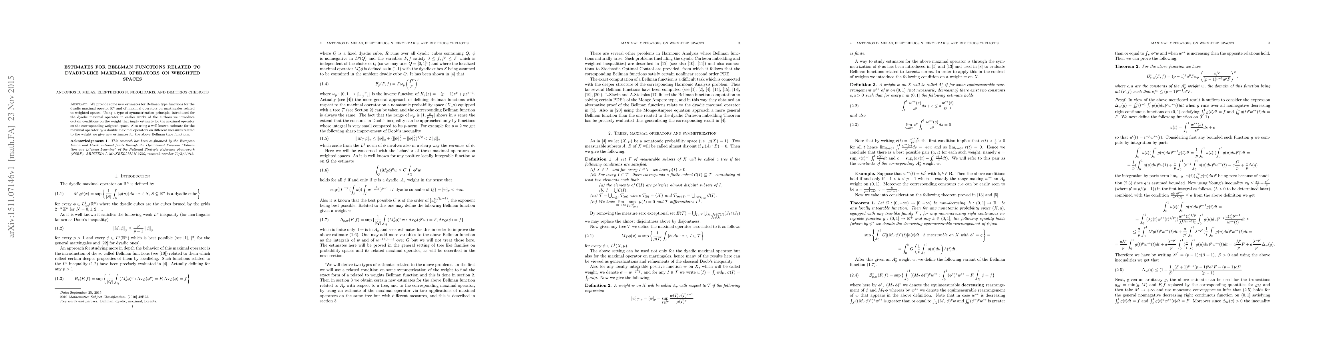 This paper presents new estimates for Bellman functions associated with dyadic maximal operators on $R^n$ and martingales in weighted spaces. The authors utilize a symmetrization principle to introduce conditions on the weight that yield estimates for the maximal operator in these weighted spaces, alongside new estimates derived from a double maximal operator approach.
