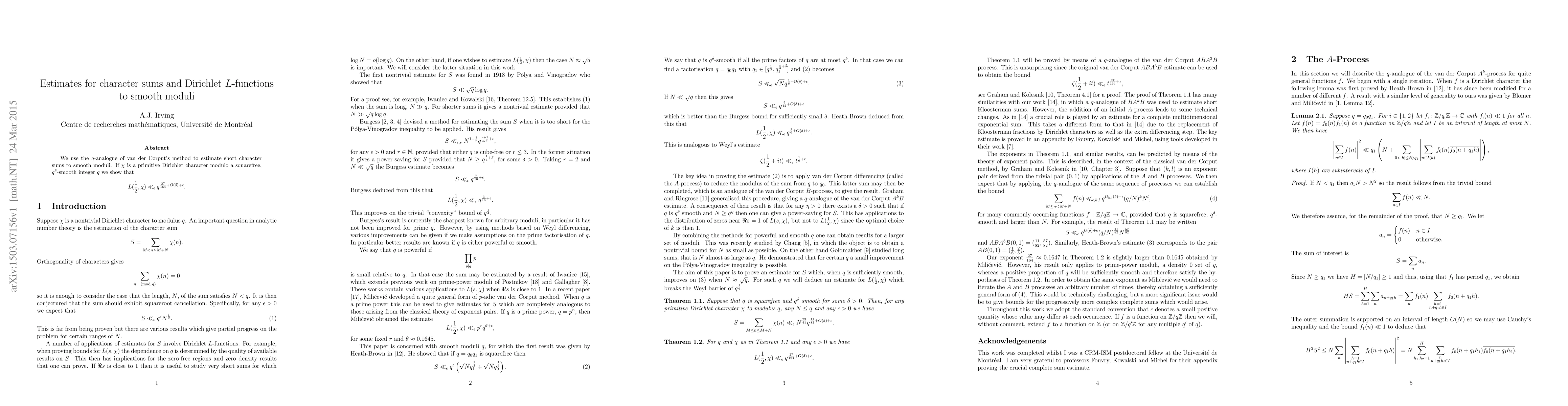 We use the $q$-analogue of van der Corput's method to estimate short character sums to smooth moduli. If $\chi$ is a primitive Dirichlet character modulo a squarefree, $q^\delta$-smooth integer $q$ we show that $$L(\frac12,\chi)\ll_\epsilon q^{\frac{27}{164}+O(\delta)+\epsilon}.$$