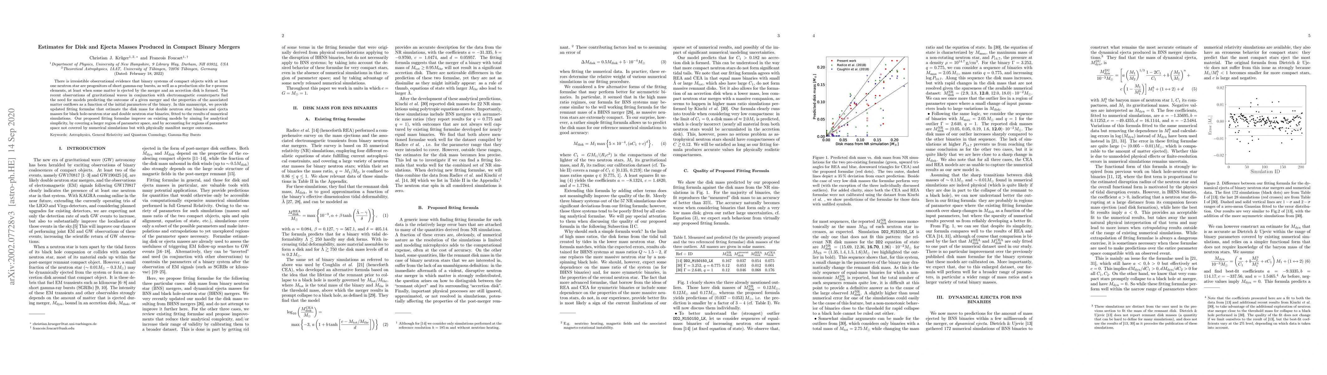 Researchers have developed new formulas to estimate the mass of disk material and ejecta produced in compact binary mergers, which could help explain gamma-ray bursts and r-process element creation. The updated models improve on existing ones by covering a larger range of parameters and accounting for merger outcomes not simulated by numerical models.