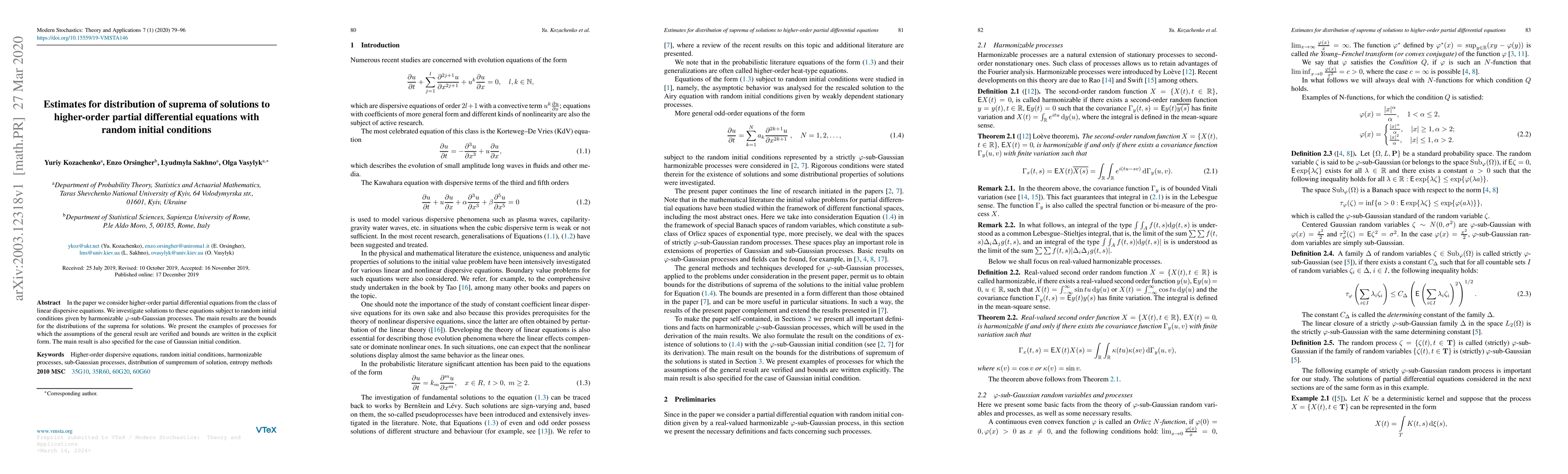 In the paper we consider higher-order partial differential equations from the class of linear dispersive equations. We investigate solutions to these equations subject to random initial conditions given by harmonizable $\varphi$-sub-Gaussian processes. The main results are the bounds for the distributions of the suprema for solutions. We present the examples of processes for which the assumptions of the general result are verified and bounds are written in the explicit form. The main result is also specified for the case of Gaussian initial condition.