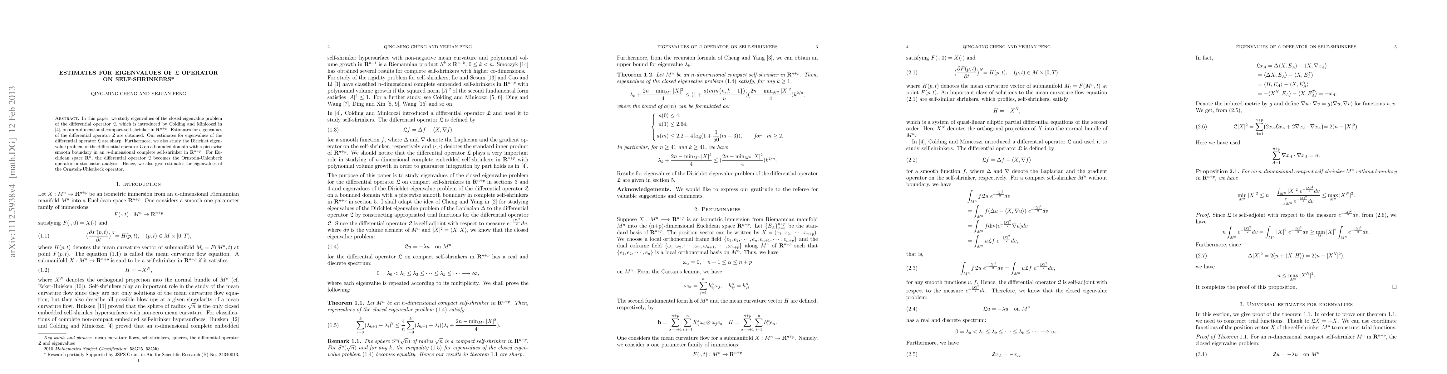 In this paper, we study eigenvalues of the closed eigenvalue problem of the differential operator $ L$, which is introduced by Colding and Minicozzi in [4], on an $n$-dimensional compact self-shrinker in ${R}^{n+p}$. Estimates for eigenvalues of the differential operator $ L$ are obtained. Our estimates for eigenvalues of the differential operator $ L$ are sharp. Furthermore, we also study the Dirichlet eigenvalue problem of the differential operator $ L$ on a bounded domain with a piecewise smooth boundary in an $n$-dimensional complete self-shrinker in $ {R}^{n+p}$. For Euclidean space $ {R}^{n}$, the differential operator $ L$ becomes the Ornstein-Uhlenbeck operator in stochastic analysis. Hence, we also give estimates for eigenvalues of the Ornstein-Uhlenbeck operator.
