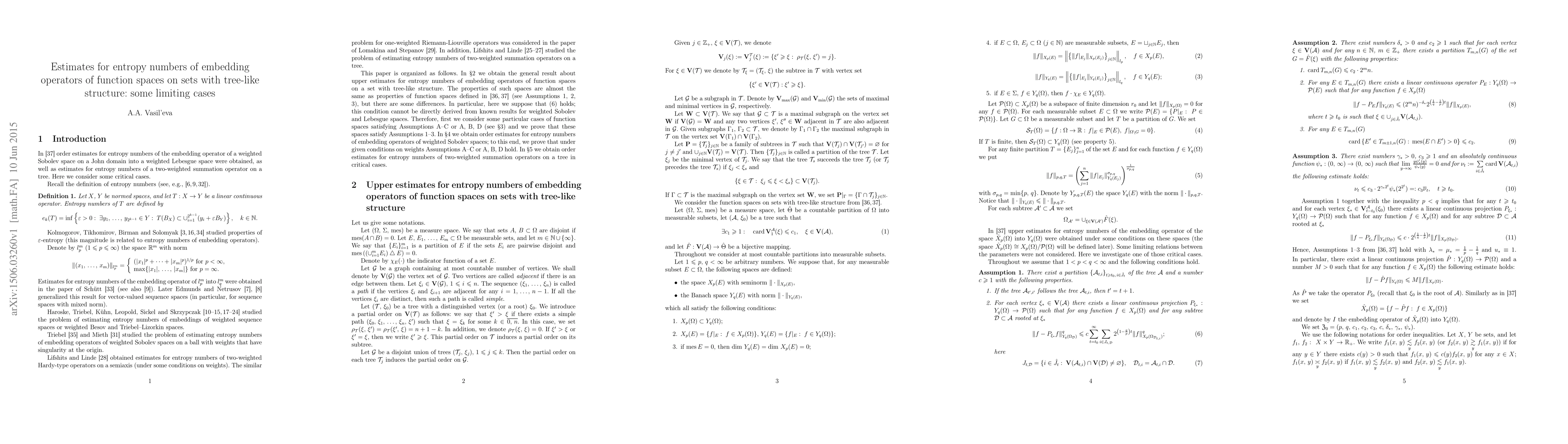 Summary: This paper provides order estimates for entropy numbers of embeddings between weighted Sobolev and Lebesgue spaces, as well as for weighted summation operators on tree structures, under specific critical conditions on the parameters.