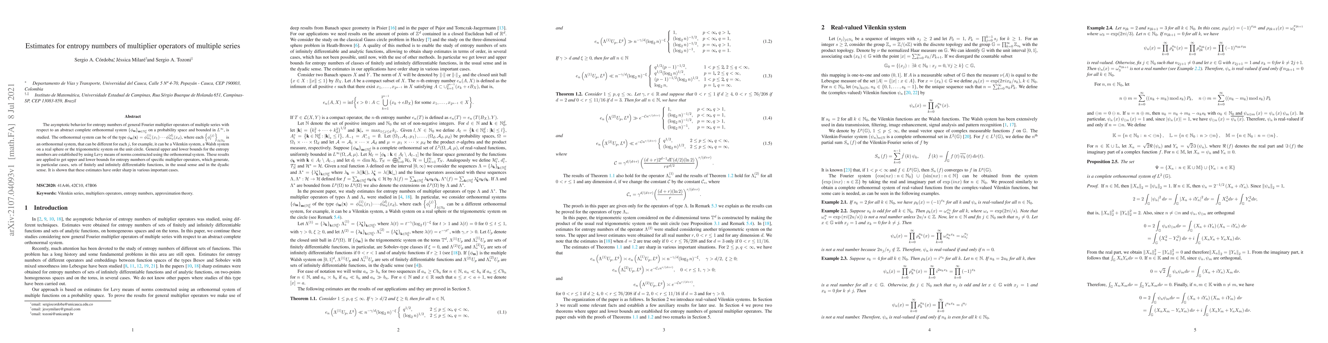 The asymptotic behavior for entropy numbers of general Fourier multiplier operators of multiple series with respect to an abstract complete orthonormal system $\{\phi_{\textbf{m}}\}_{\textbf{m}\in \mathbb{N}^d_0}$ on a probability space and bounded in $L^{\infty}$, is studied. The orthonormal system can be of the type $\phi_{\textbf{m}}(\textbf{x}) = \phi_{m_1}^{(1)}(x_1)\cdots \phi_{m_d}^{(d)}(x_d)$, where each $\left\{\phi_{l}^{(j)}\right\}_{l\in \mathbb{N}_0}$ is an orthonormal system, that can be different for each $j$, for example, it can be a Vilenkin system, a Walsh system on a real sphere or the trigonometric system on the unit circle. General upper and lower bounds for the entropy numbers are established by using Levy means of norms constructed using the orthonormal system. These results are applied to get upper and lower bounds for entropy numbers of specific multiplier operators, which generate, in particular cases, sets of finitely and infinitely differentiable functions, in the usual sense and in the dyadic sense. It is shown that these estimates have order sharp in various important cases.