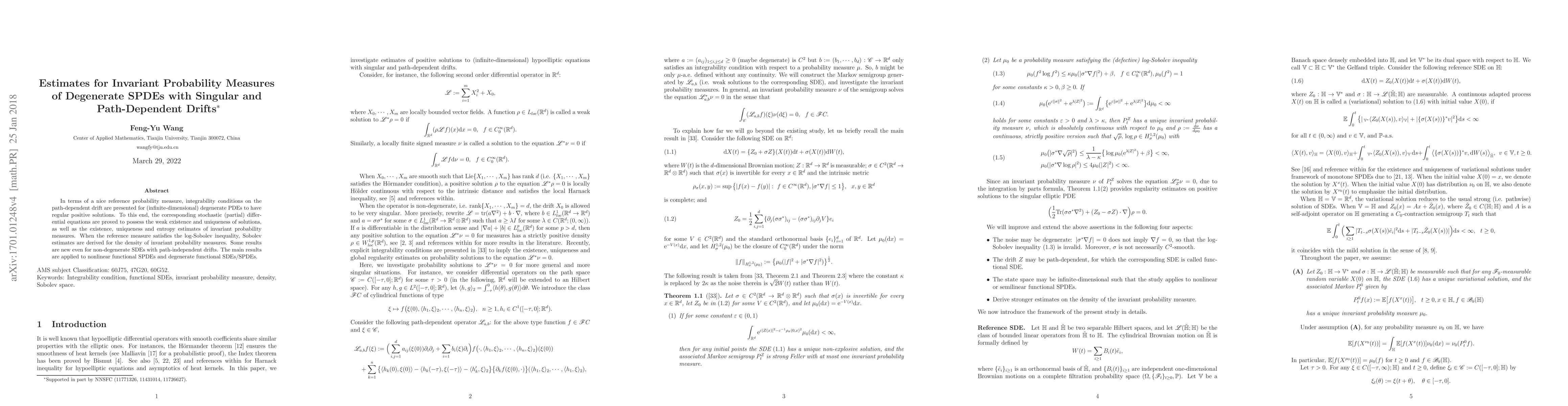 In terms of a nice reference probability measure, integrability conditions on the path-dependent drift are presented for (infinite-dimensional) degenerate PDEs to have regular positive solutions. To this end, the corresponding stochastic (partial) differential equations are proved to possess the weak existence and uniqueness of solutions, as well as the existence, uniqueness and entropy estimates of invariant probability measures. When the reference measure satisfies the log-Sobolev inequality, Sobolev estimates are derived for the density of invariant probability measures. Some results are new even for non-degenerate SDEs with path-independent drifts. The main results are applied to nonlinear functional SPDEs and degenerate functional SDEs/SPDEs.