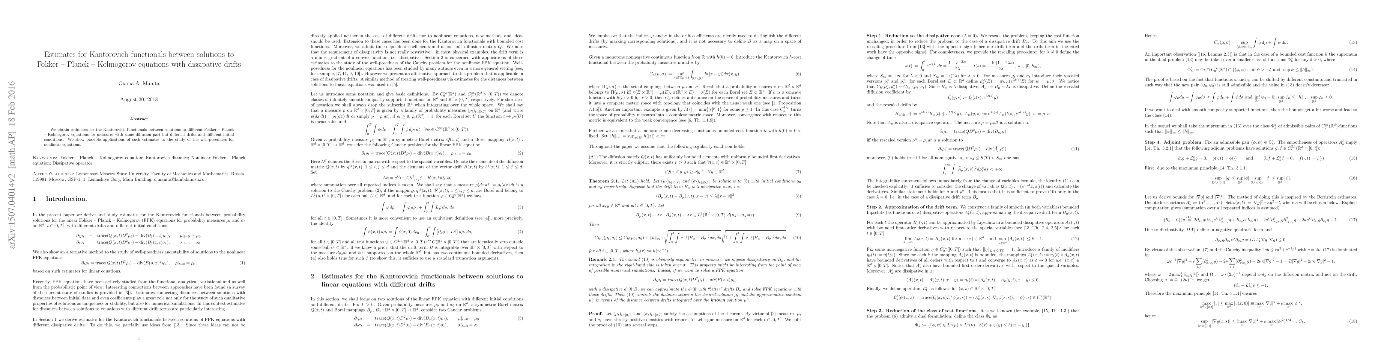 Summary: This paper provides estimates for Kantorovich functionals between solutions to Fokker-Planck-Kolmogorov equations with varying dissipative drifts and initial conditions. The results have potential applications in studying the well-posedness of nonlinear equations.