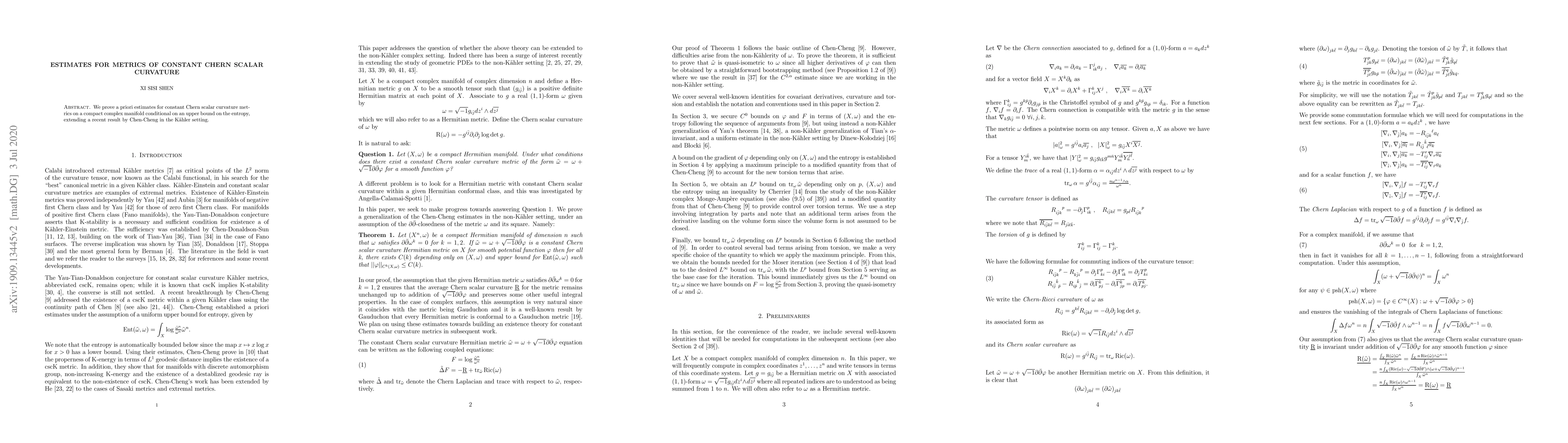This paper proves a priori estimates for constant Chern scalar curvature metrics on compact complex manifolds with a given entropy bound, extending previous results.