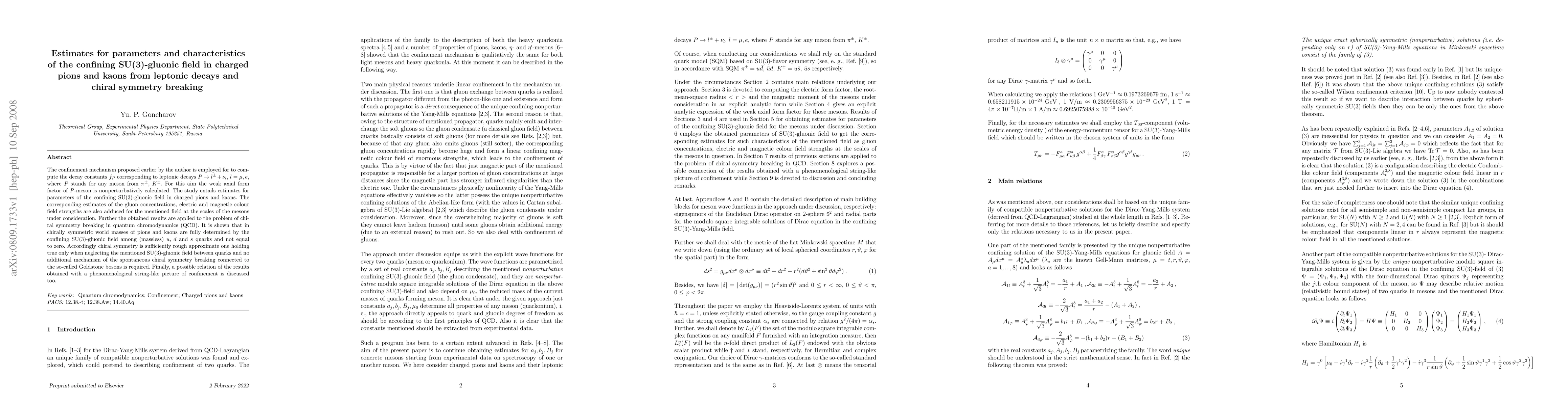 The paper presents a confinement mechanism to compute decay constants of leptonic decays in charged pions and kaons, estimating parameters of the confining SU(3)-gluonic field. It also discusses chiral symmetry breaking in QCD, suggesting that in a chirally symmetric world, meson masses arise from the confining SU(3)-gluonic field among massless quarks, negating the need for additional spontaneous chiral symmetry breaking mechanisms. The findings are linked to a phenomenological string-like confinement picture.
