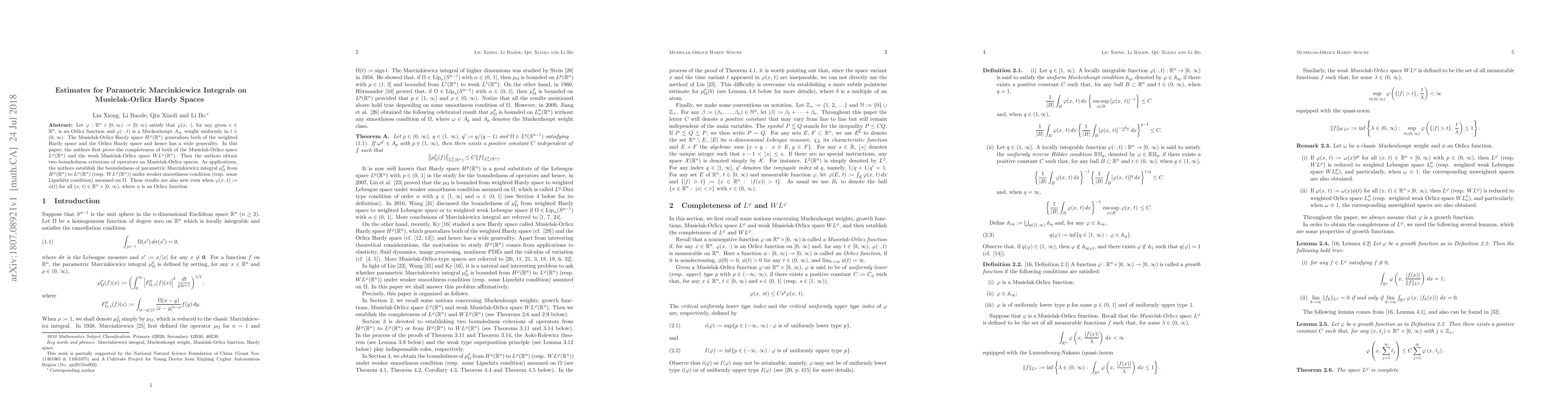 Let $\varphi:\mathbb{R}^n\times[0,\,\infty) \rightarrow [0,\,\infty)$ satisfy that $\varphi(x,\,\cdot)$, for any given $x\in\mathbb{R}^n$, is an Orlicz function and $\varphi(\cdot\,,t)$ is a Muckenhoupt $A_\infty$ weight uniformly in $t\in(0,\,\infty)$. The Musielak-Orlicz Hardy space $H^\varphi(\mathbb{R}^n)$ generalizes both of the weighted Hardy space and the Orlicz Hardy space and hence has a wide generality. In this paper, the authors first prove the completeness of both of the Musielak-Orlicz space $L^\varphi(\mathbb{R}^n)$ and the weak Musielak-Orlicz space $WL^\varphi(\mathbb{R}^n)$. Then the authors obtain two boundedness criterions of operators on Musielak-Orlicz spaces. As applications, the authors establish the boundedness of parametric Marcinkiewicz integral $\mu^\rho_\Omega$ from $H^\varphi(\mathbb{R}^n)$ to $L^\varphi(\mathbb{R}^n)$ (resp. $WL^\varphi(\mathbb{R}^n)$) under weaker smoothness condition (resp. some Lipschitz condition) assumed on $\Omega$. These results are also new even when $\varphi(x,\,t):=\phi(t)$ for all $(x,\,t)\in\mathbb{R}^n\times[0,\,\infty)$, where $\phi$ is an Orlicz function.